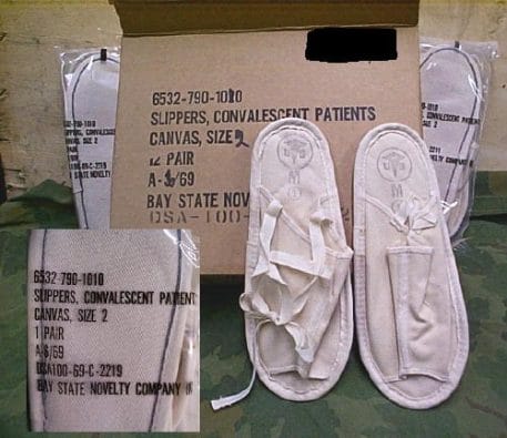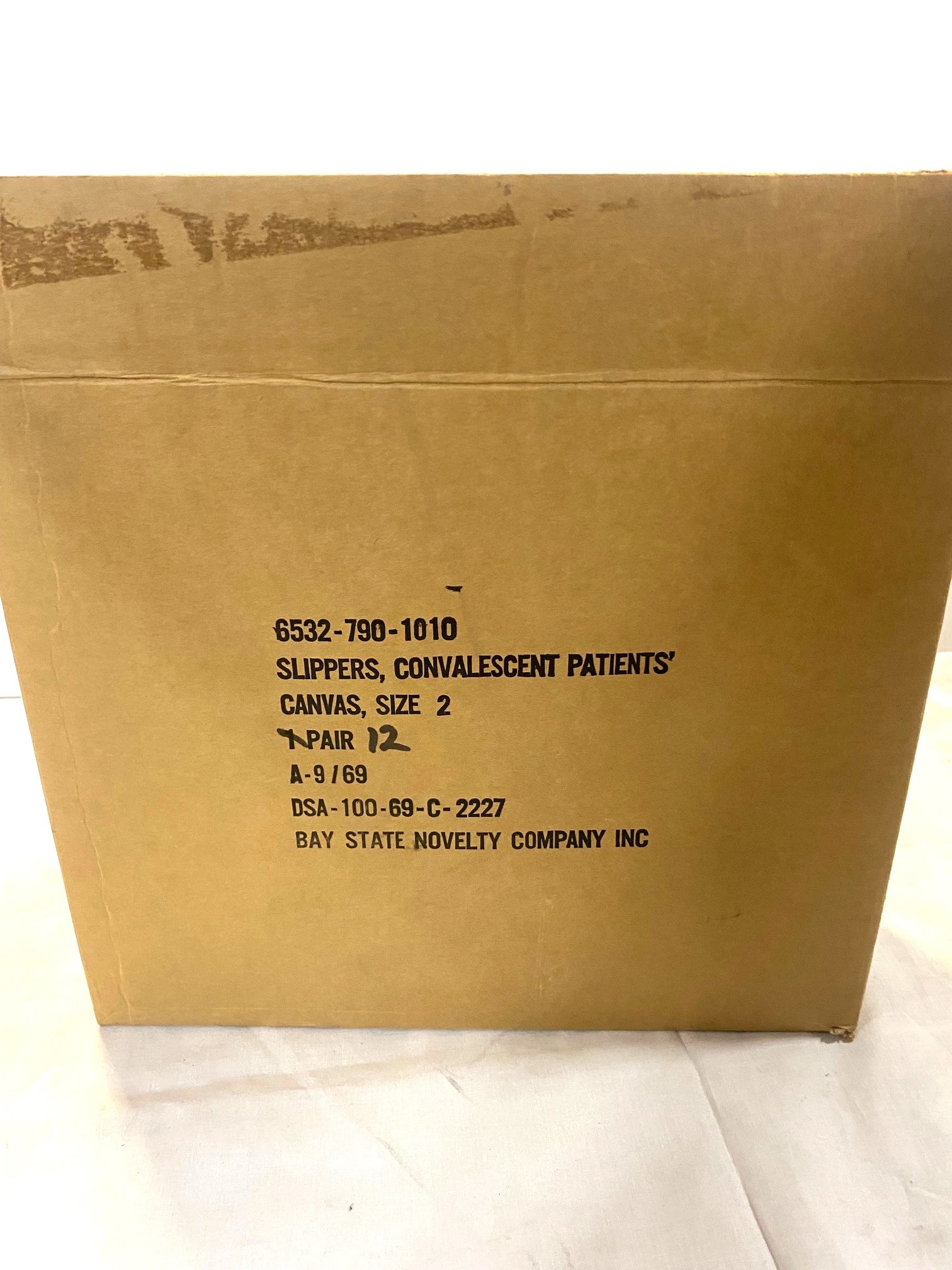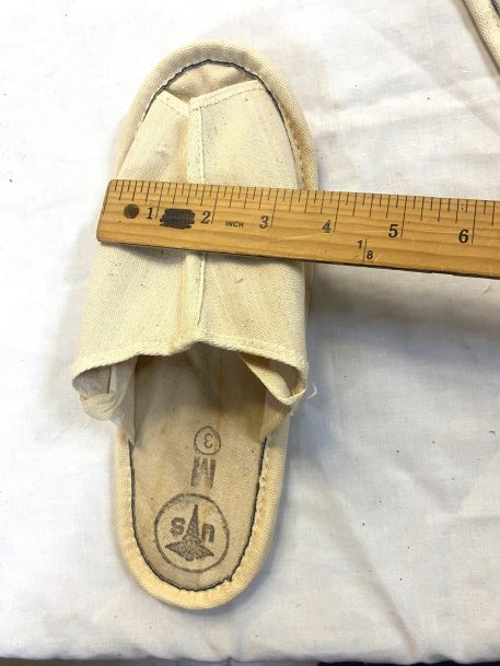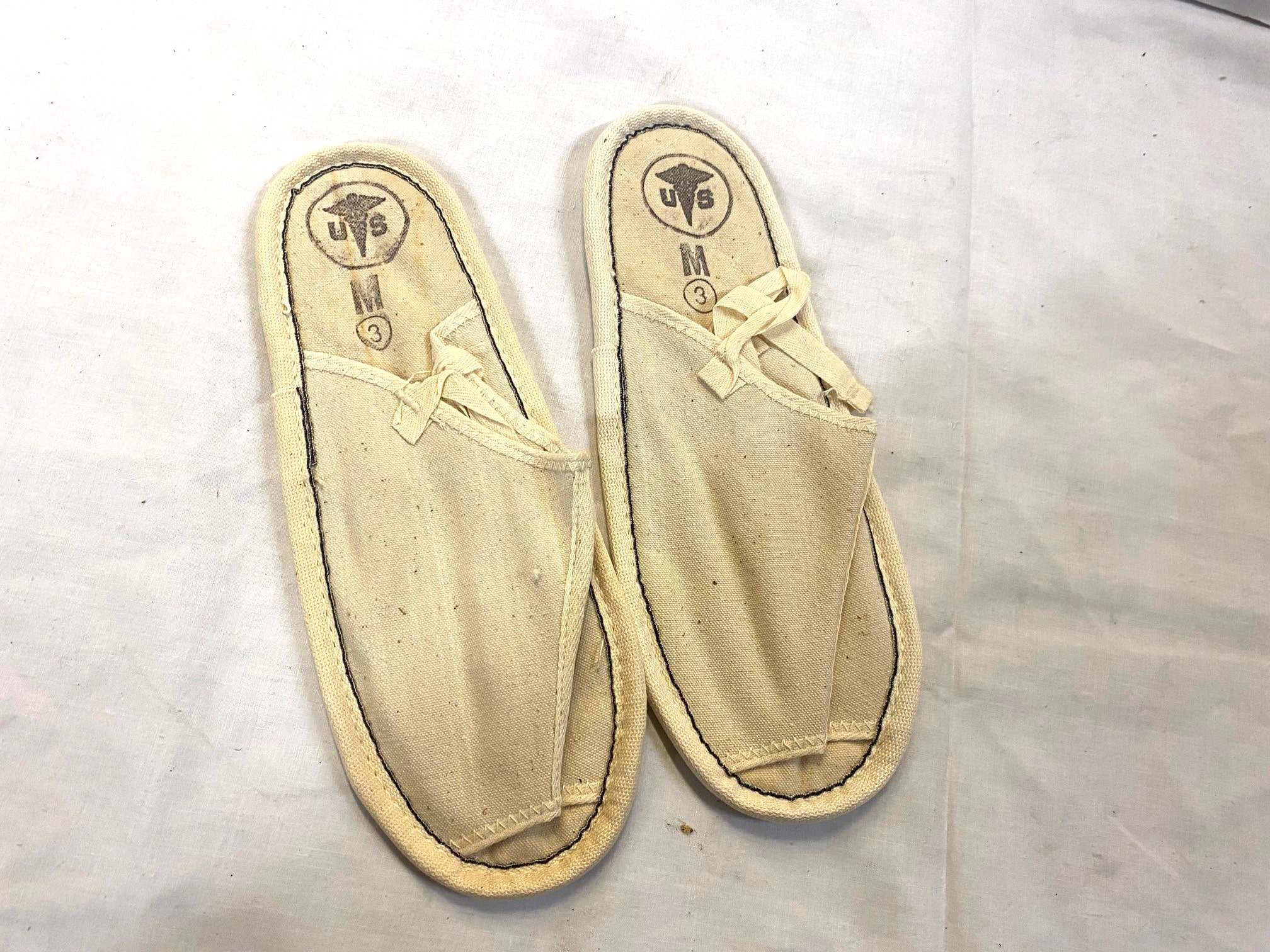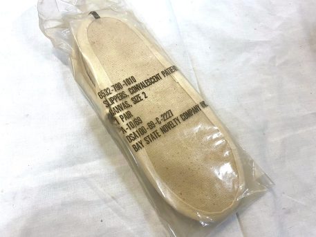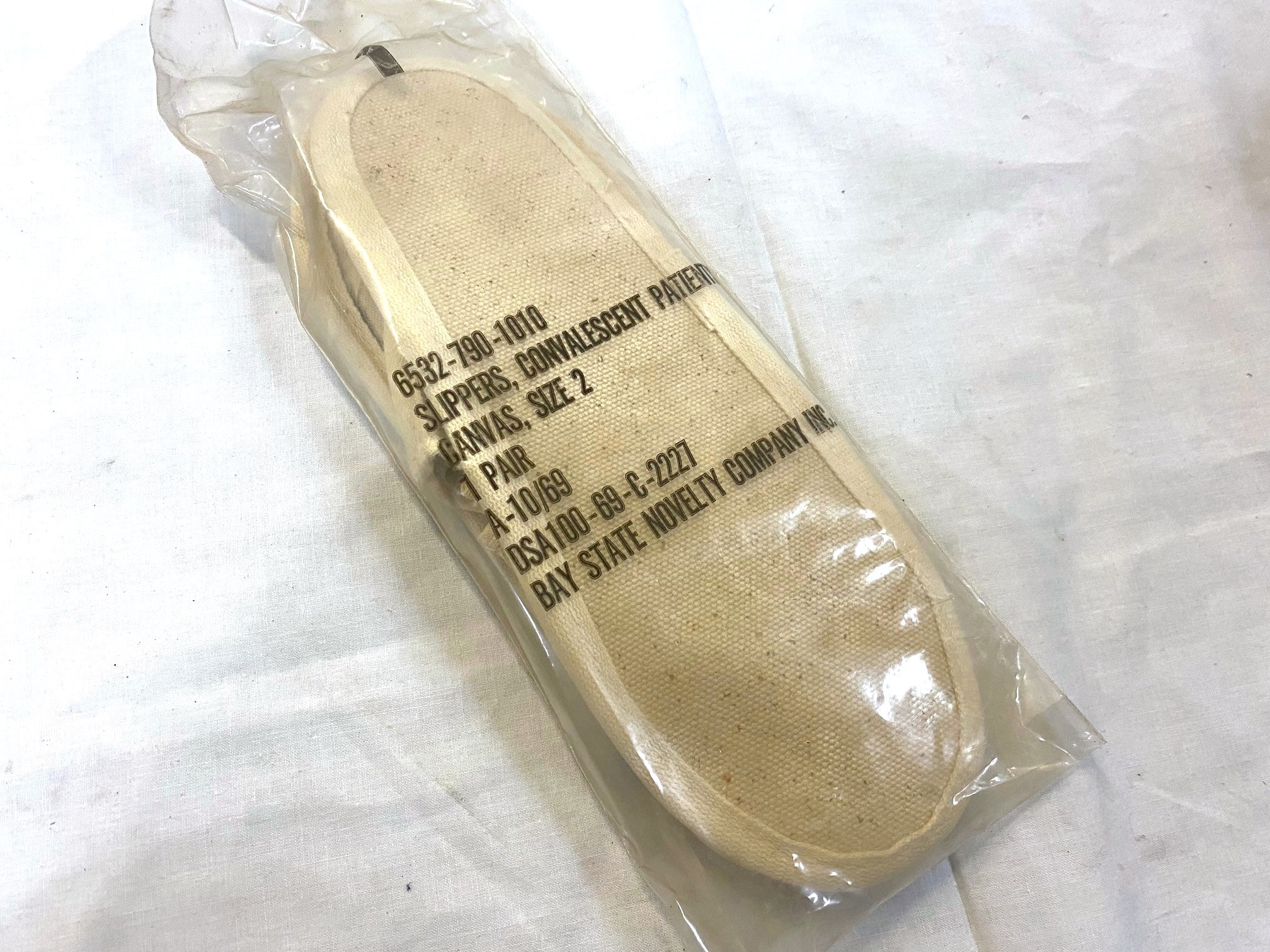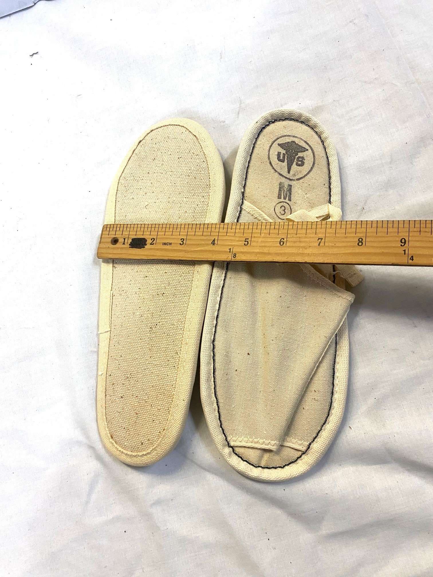 Original Vietnam Surplus. Dated 1969. Military issue hospital slippers. Still sealed in original packs. Size 2 only (fits about 8-9 shoe size). Price is per pair of slippers.