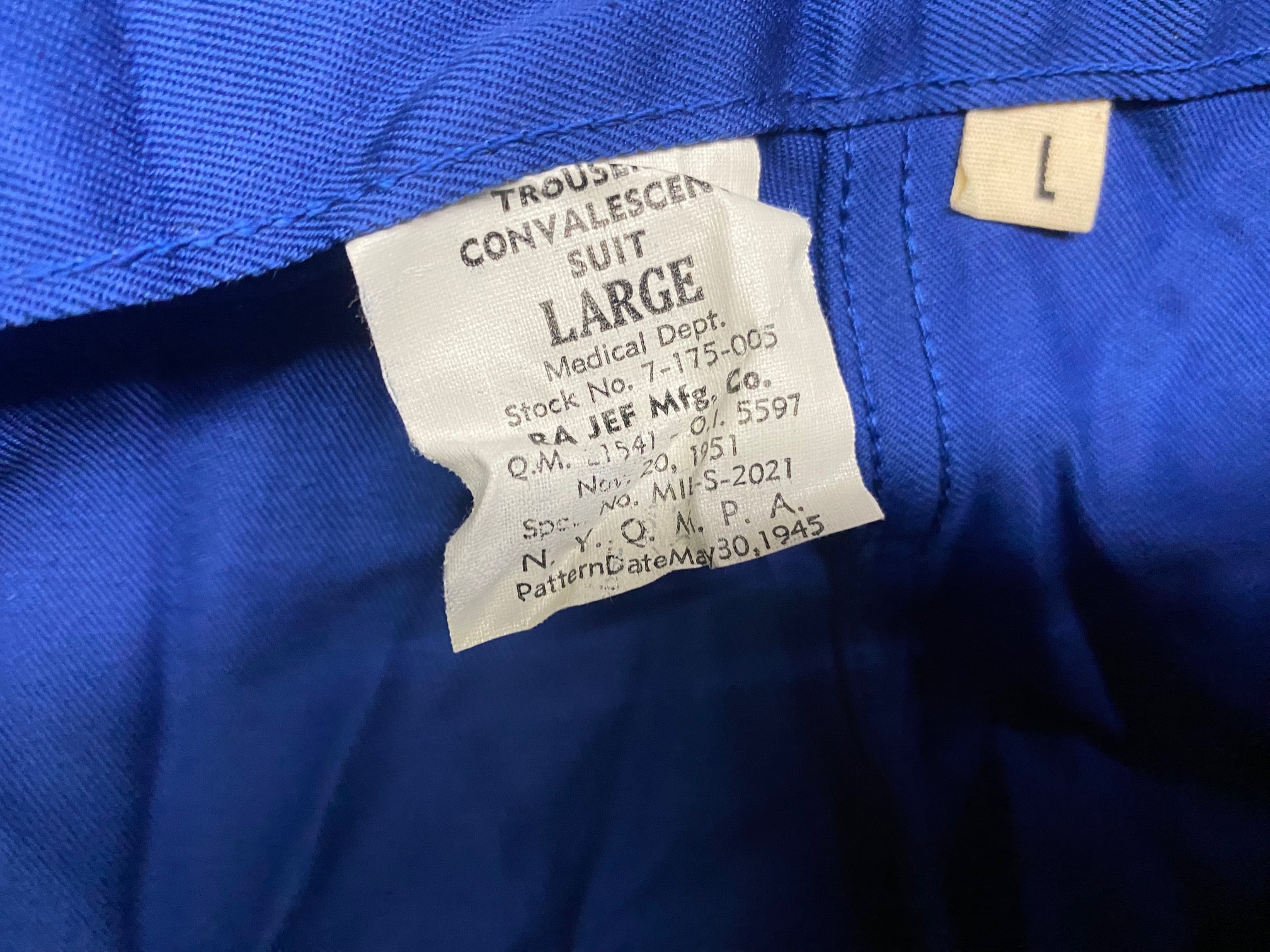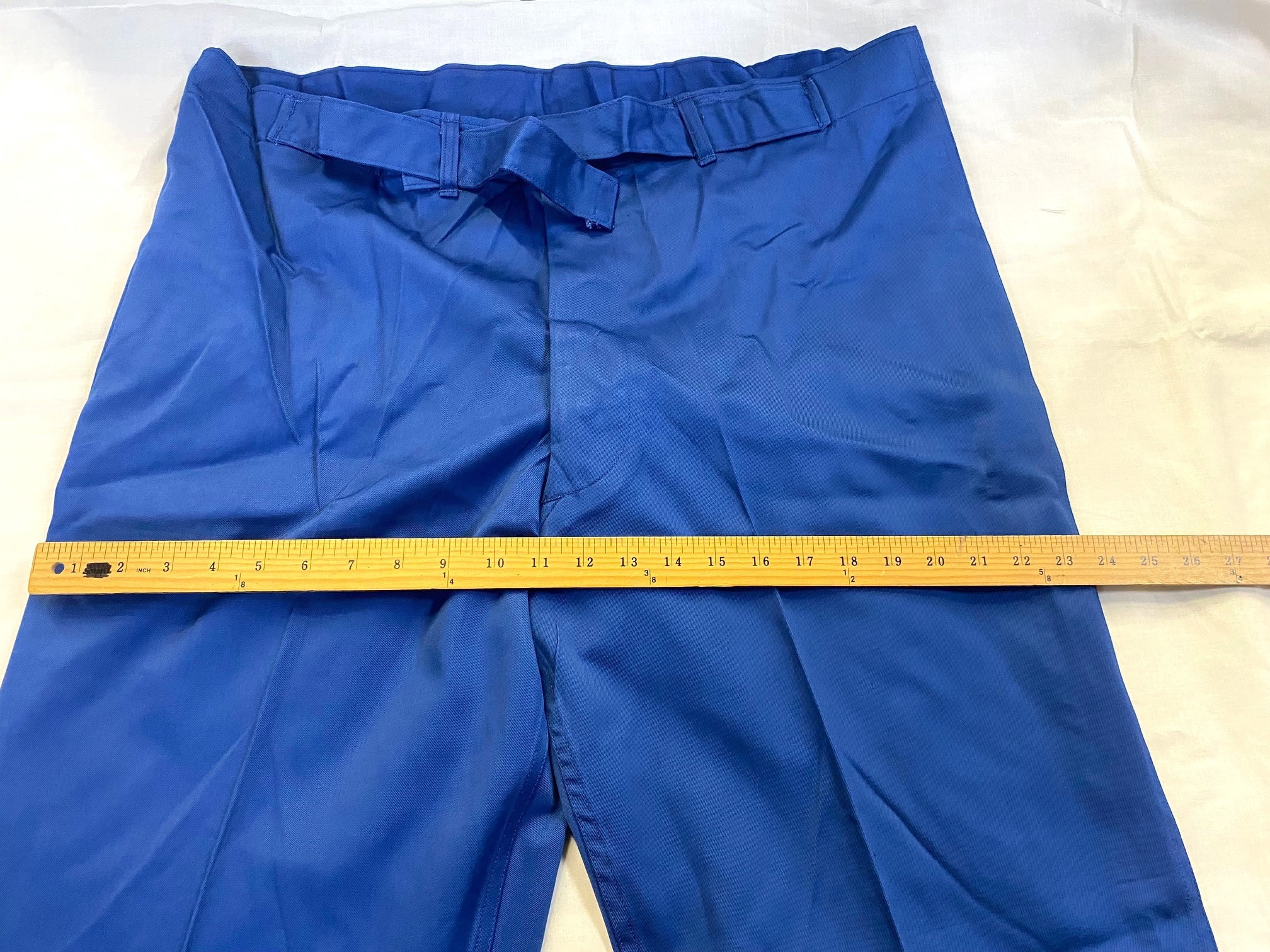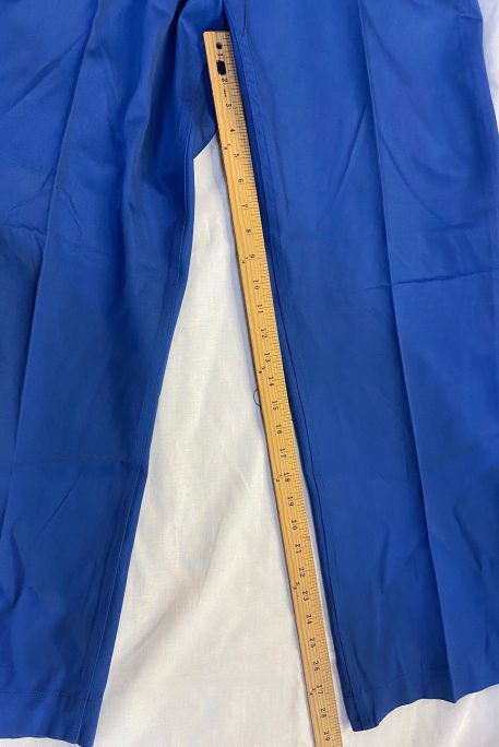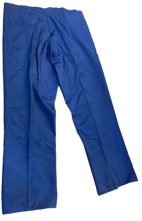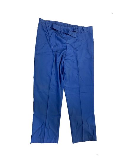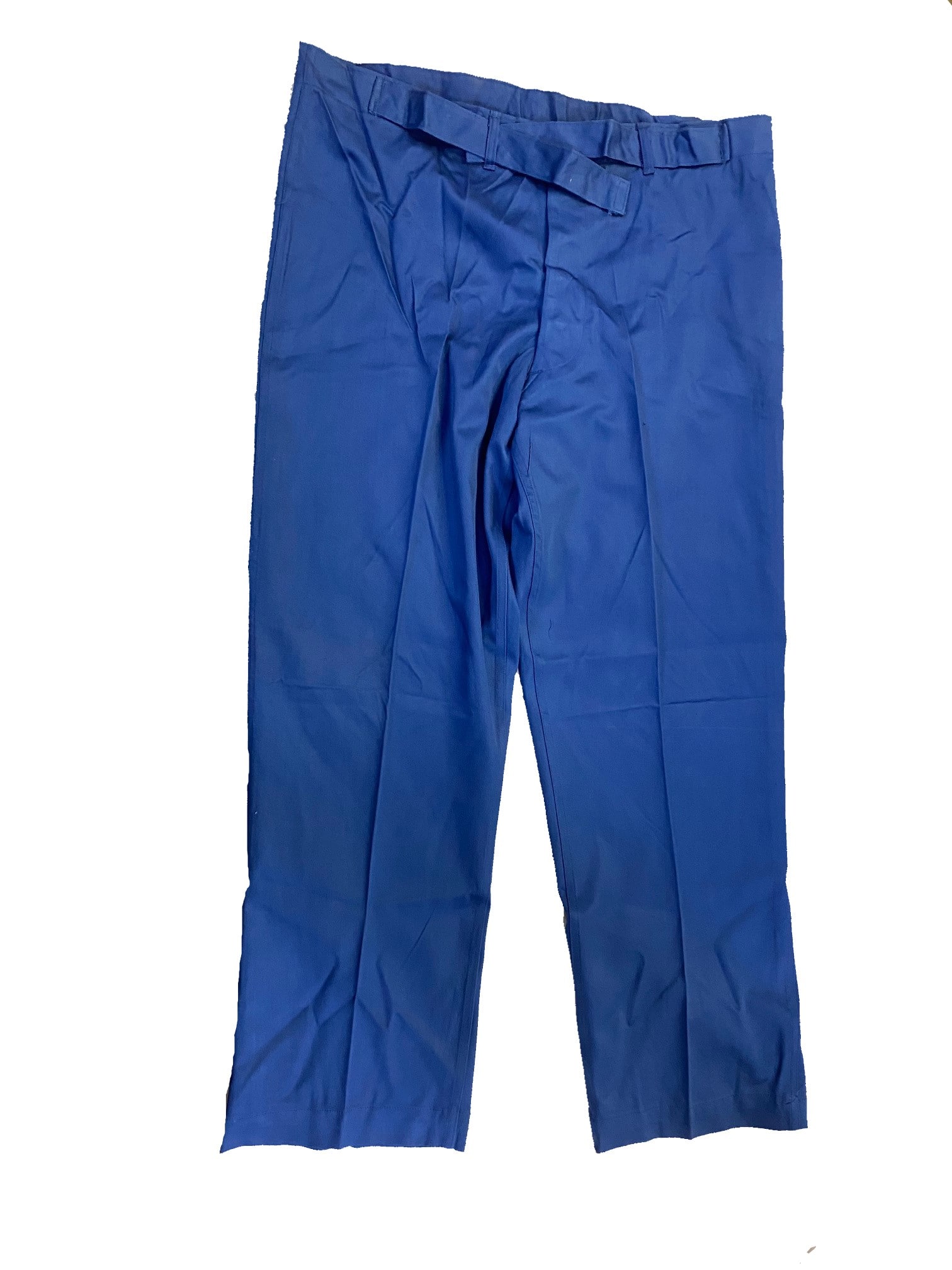 New original dated 1951 convalescent hospital trousers. Royal blue cotton. Large size adjustable 35-39 waist. New old stock condition. Great for pajamas.