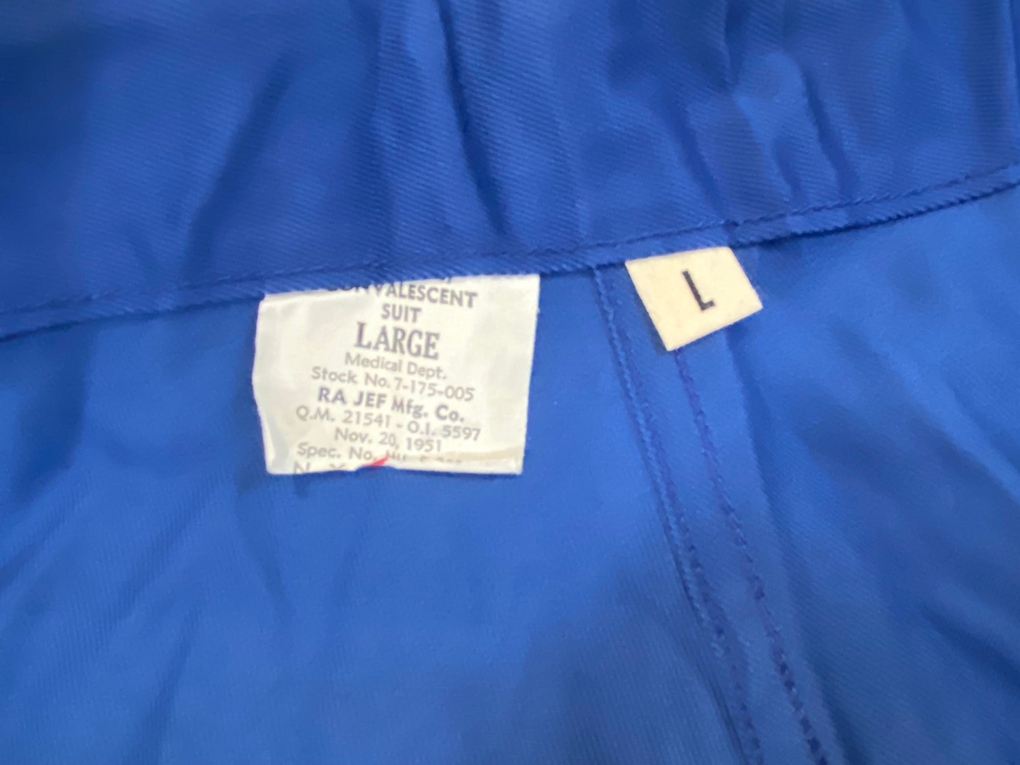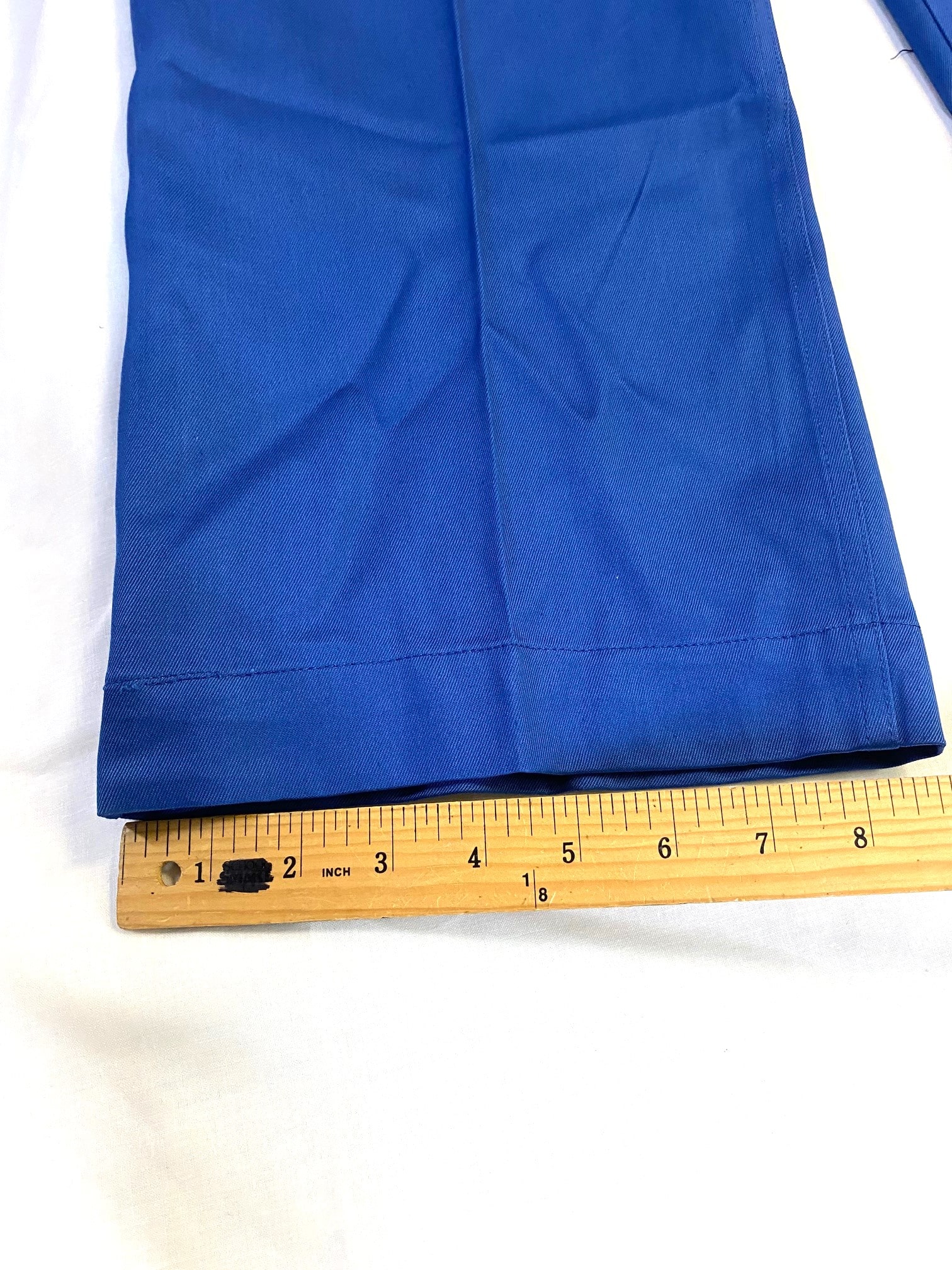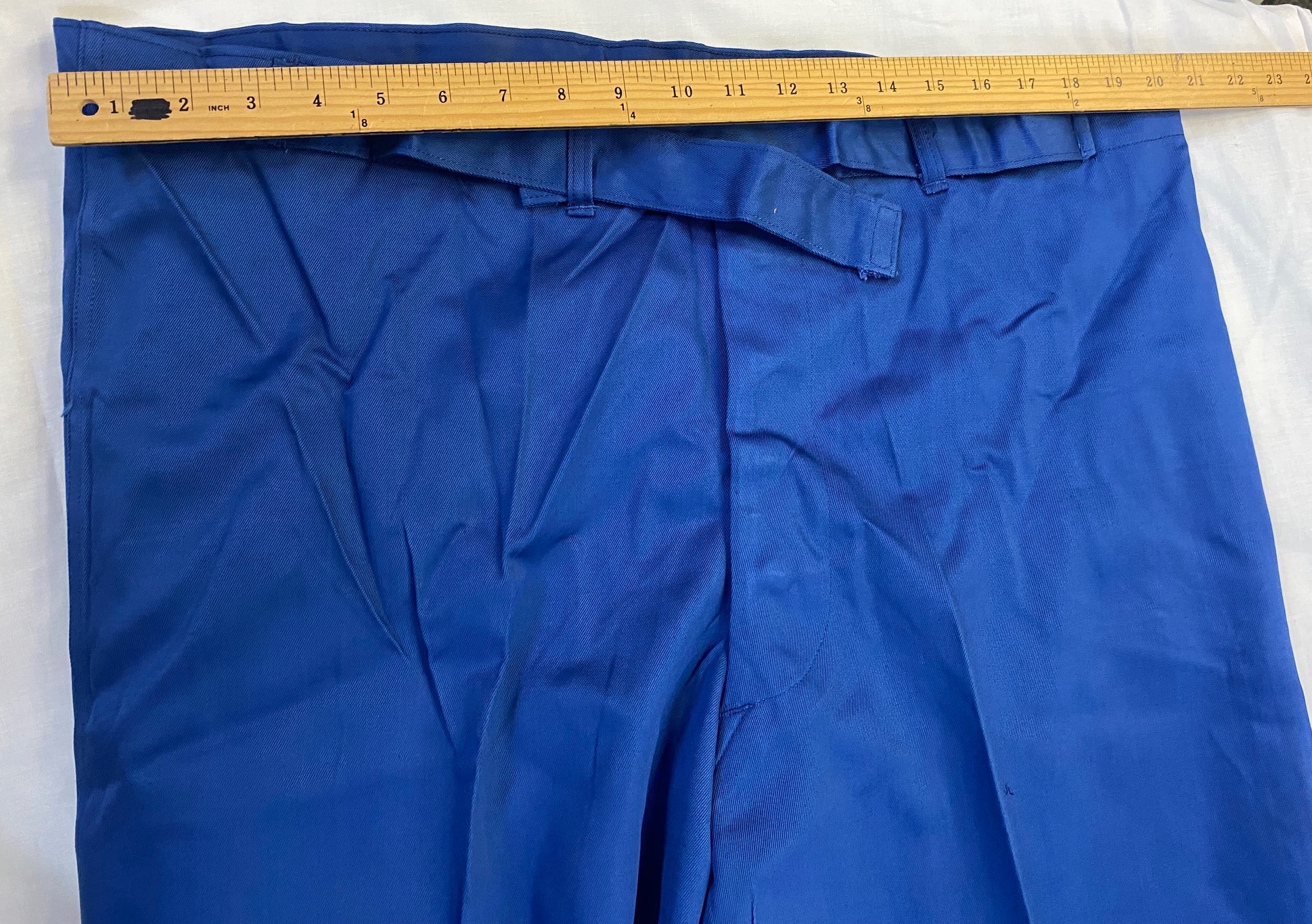 New original dated 1951 convalescent hospital trousers. Royal blue cotton. Large size adjustable 35-39 waist. New old stock condition. Great for pajamas.