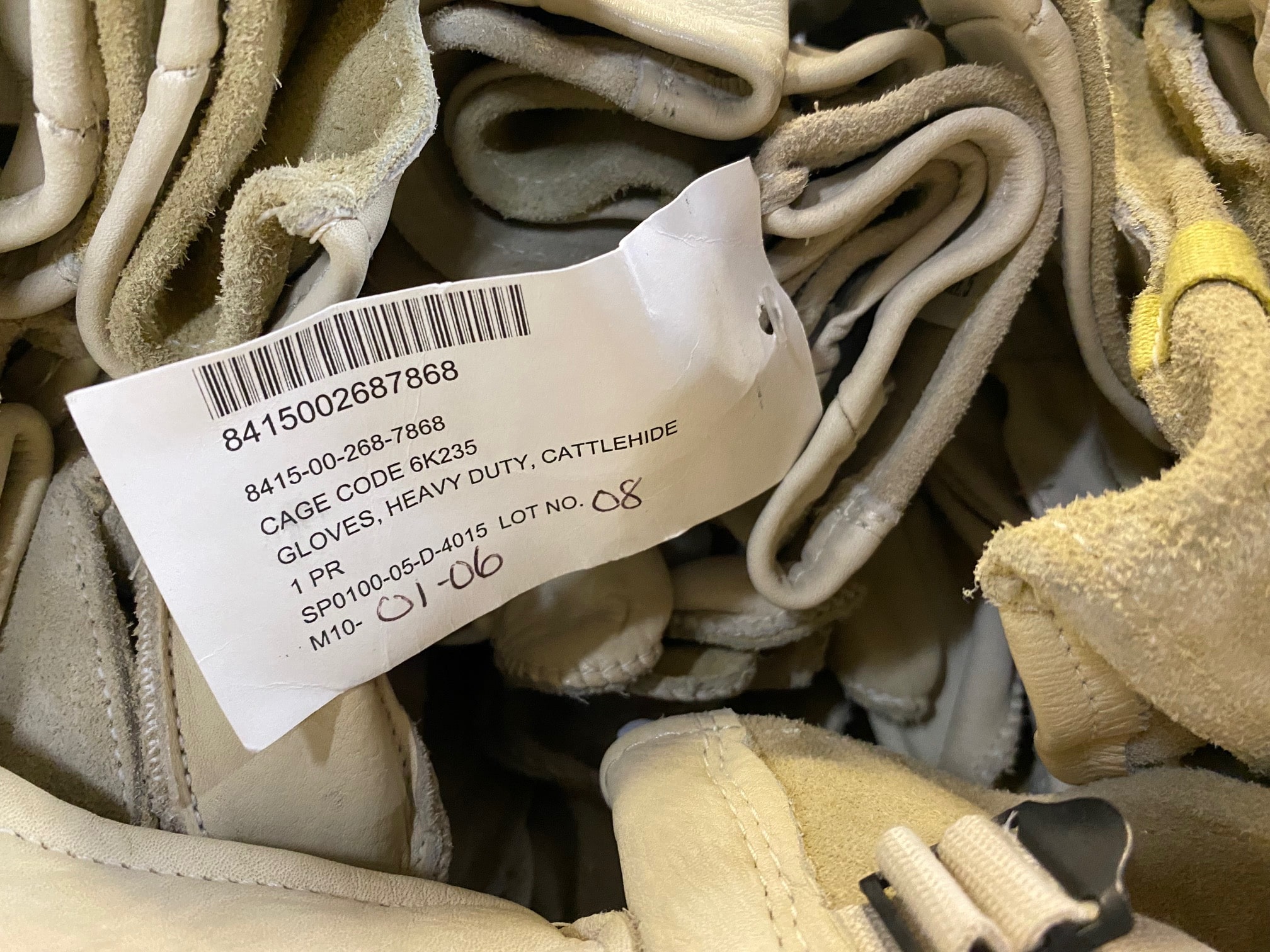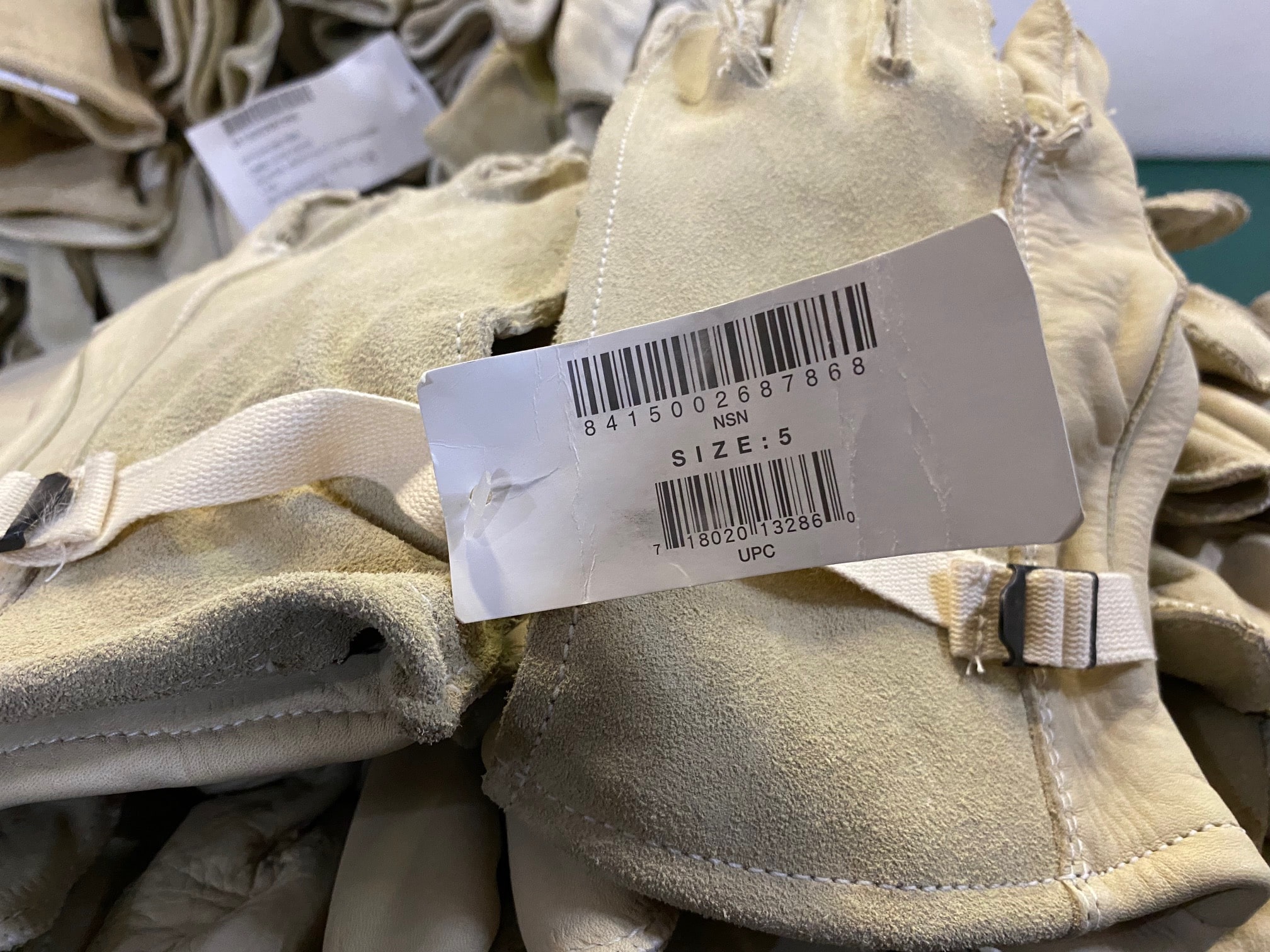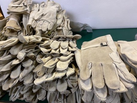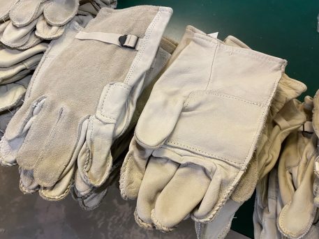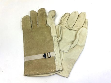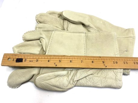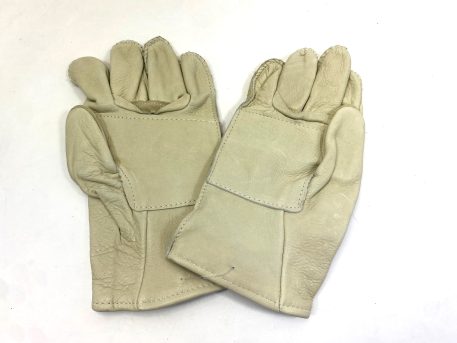 Surplus stock heavy duty cattlehide leather work gloves. D3-A. Tan/Khaki. Size 5 only. New condition.