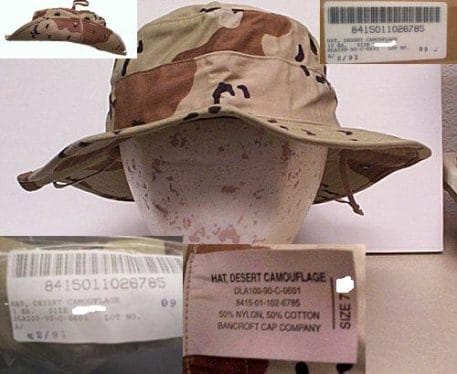 Original Chocolate Chip Desert Boonie hats worn by our forces in the middle east Persian Gulf area during Desert Shield and Desert Storm. Full brim cover. Manufactured from 1984-1991. The famous “chocolate chip” 6 color desert camouflage pattern. 2.25 inch wide brim 5.715cm