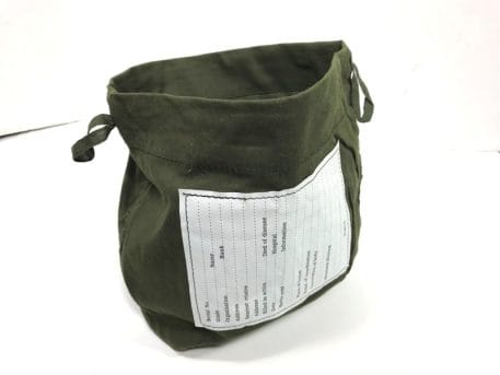 Ditty bag, Military issue. Light weight and strong cotton material with two-way draw-string. This ditty is the perfect size for organizing all those small, loose items. They are new old stock, starting to show a little oxidation on the metal rings that the string goes through and some stiffness in material. Size is approx 8″ x 10″ x 7″.