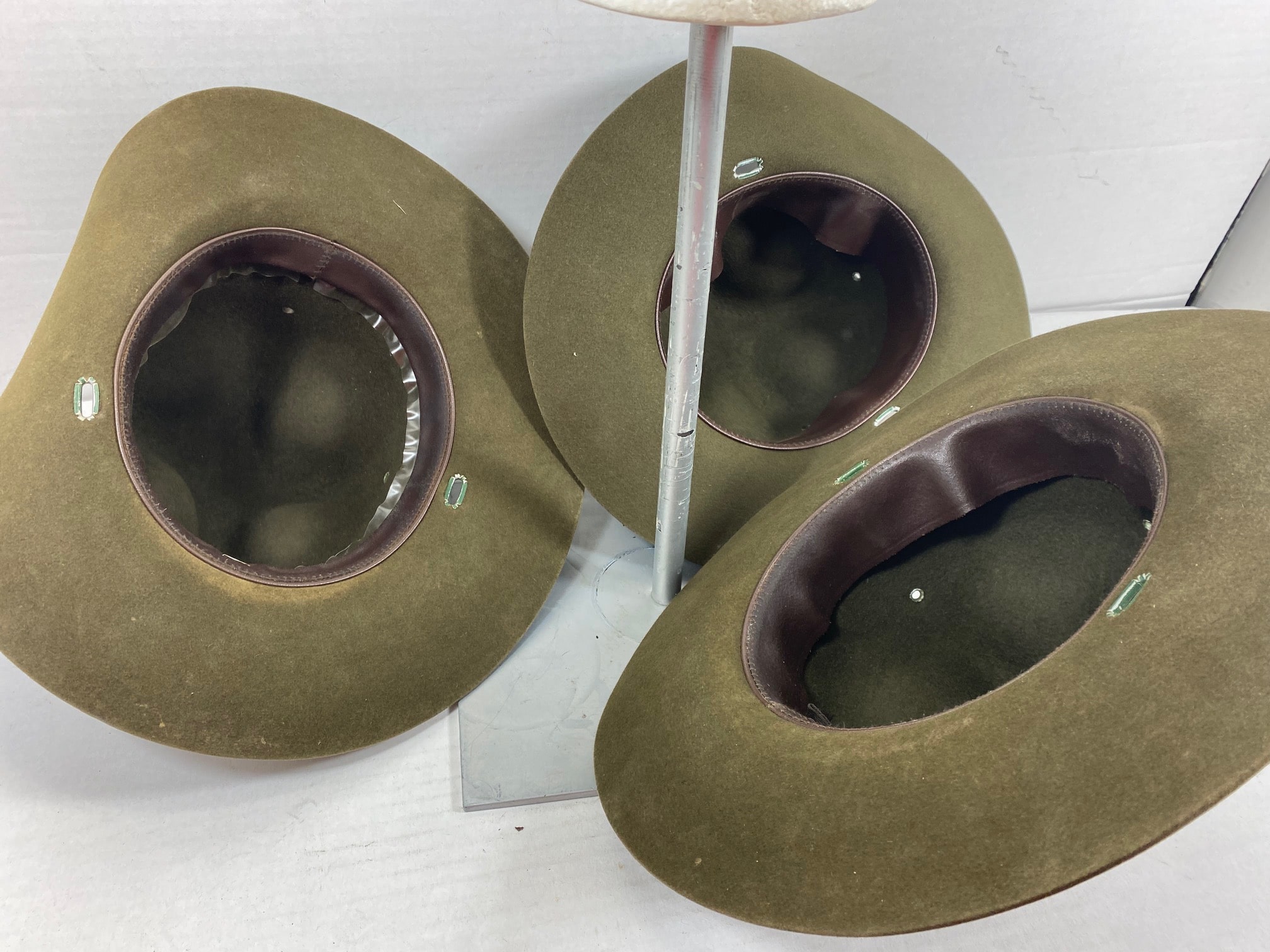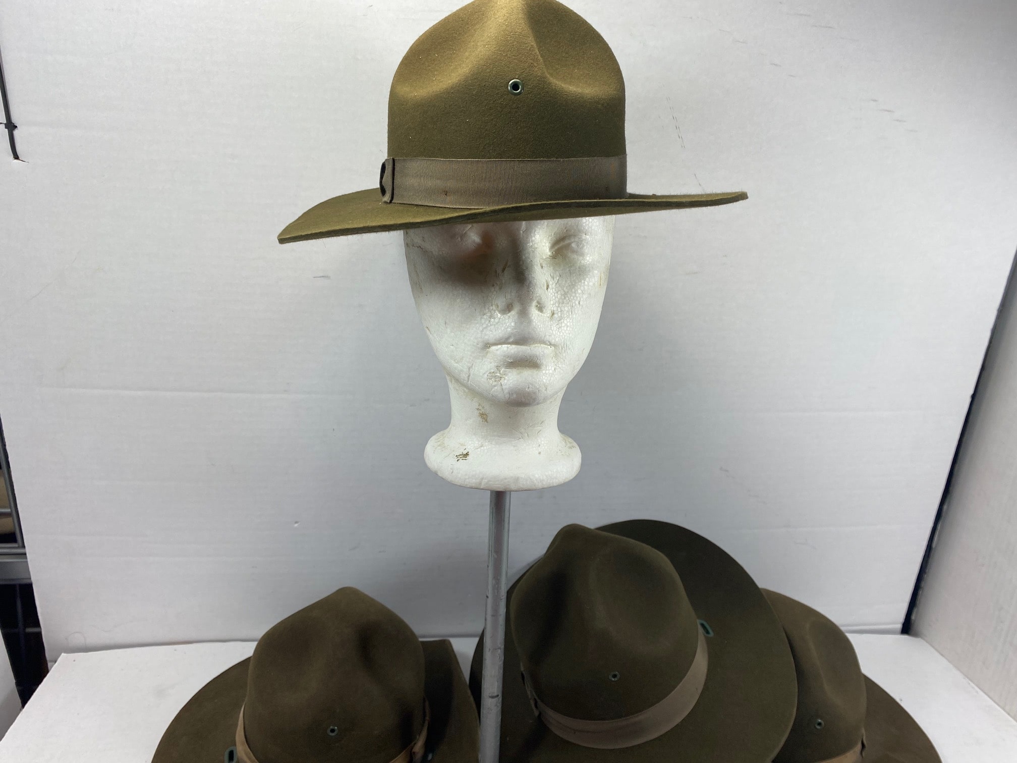 Old stock campaign hats from fair to good condition. Some warping and staining/discoloration from storage and years in hot warehouses. No chinstraps.