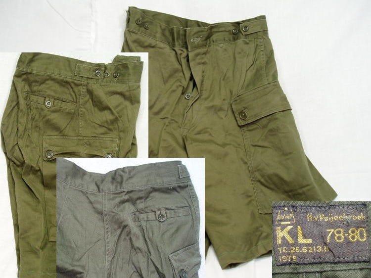 Cut-off from the dutch army hbt, or mole-skin field trouser. Not many left. All size 30 waist. 3-pocket 2 side 1 back. No front pockets.
