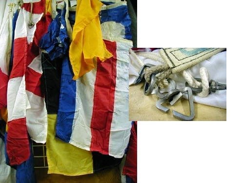 East German Navy Ships Signal Flag. New condition. Many shapes and colors. Most are about 2 ft. Aluminum halyard links. Colors vary. Price is per flag.