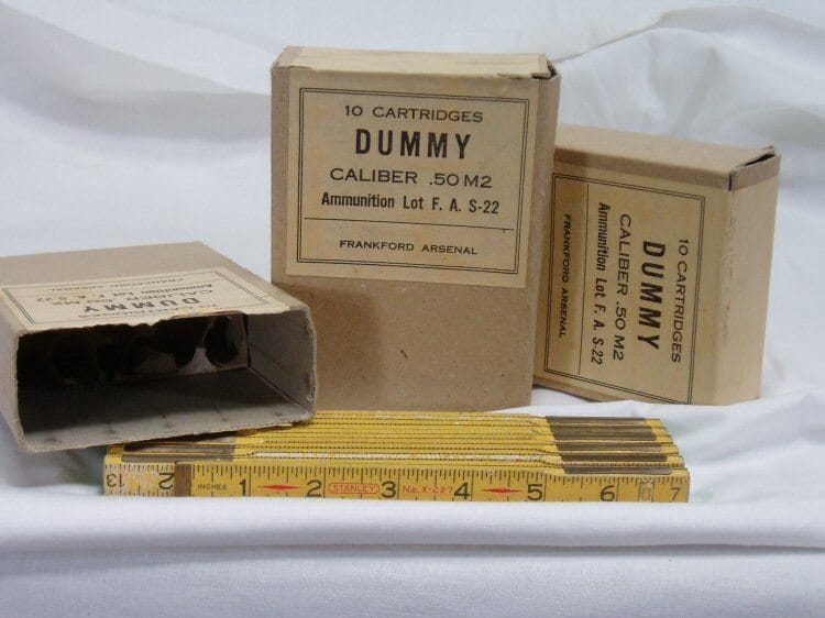 Great for displays and decor. Just the empty cardboard box for inert 50 caliber machine gun practice rounds. No shells in these just empty cardboard box, in various states of openness. The pictures are what to expect: Missing tops, folded in bottoms, repairs with tape, tears. Used old boxes with legible labels. *Fair condition*