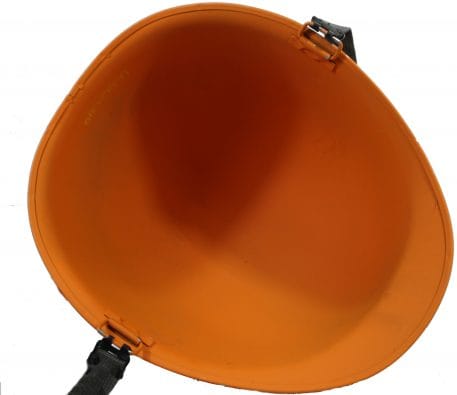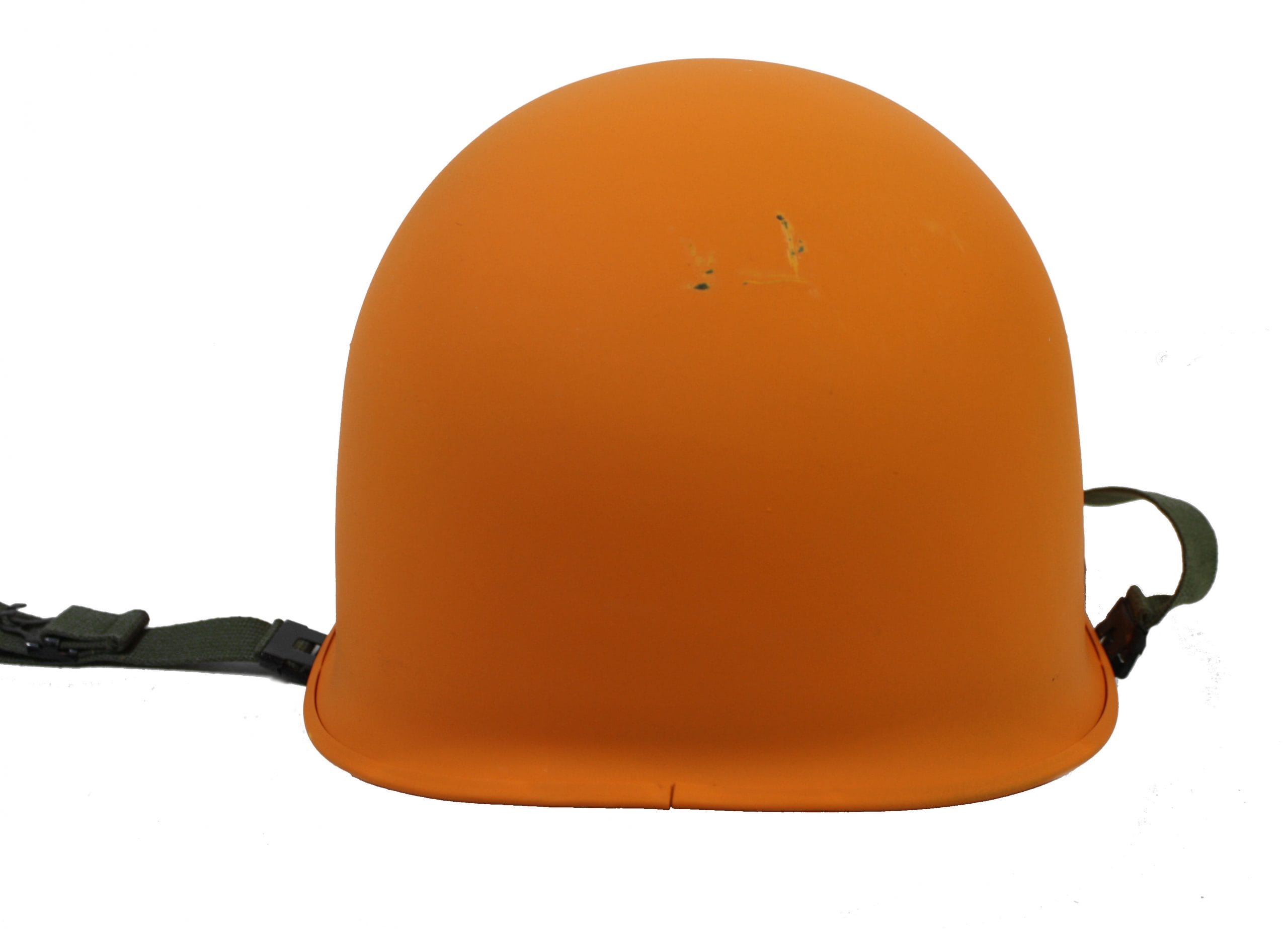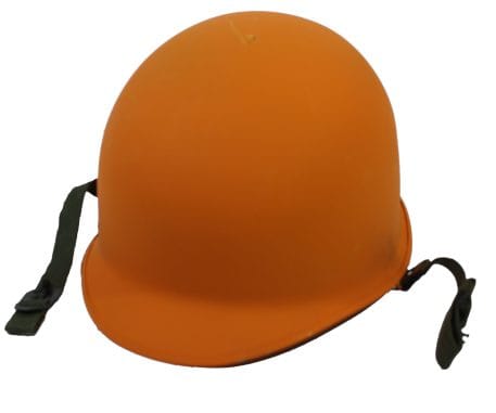 Military m-1 style helmet with the cotton Vietnam era chinstrap. Super good deal if you can stand the orange color; or just paint olive drab over it.