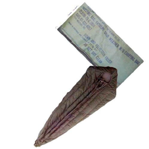 Military issue designed to provide warmth down to -10 degrees. Green with hollofil and feather insulation.