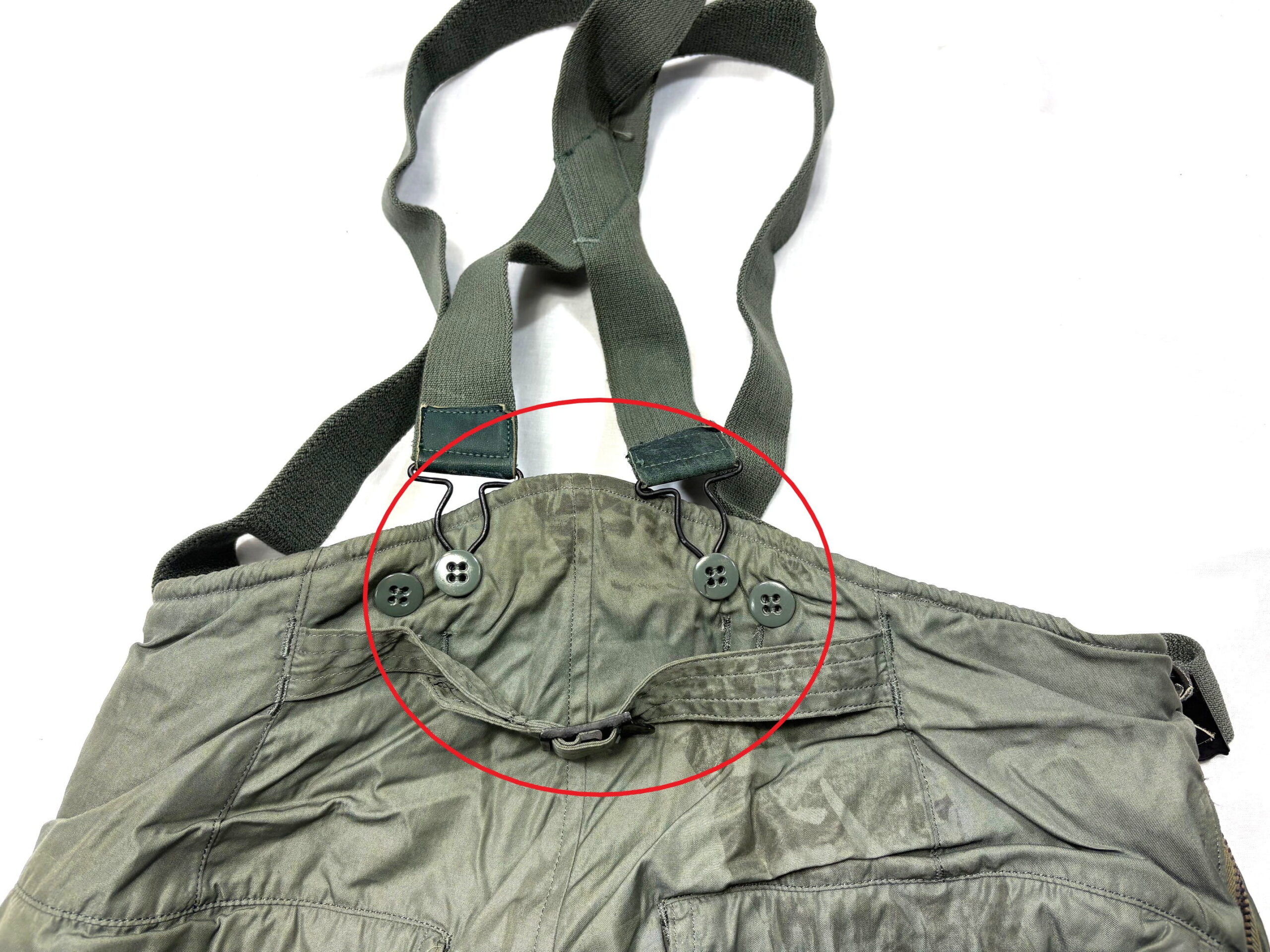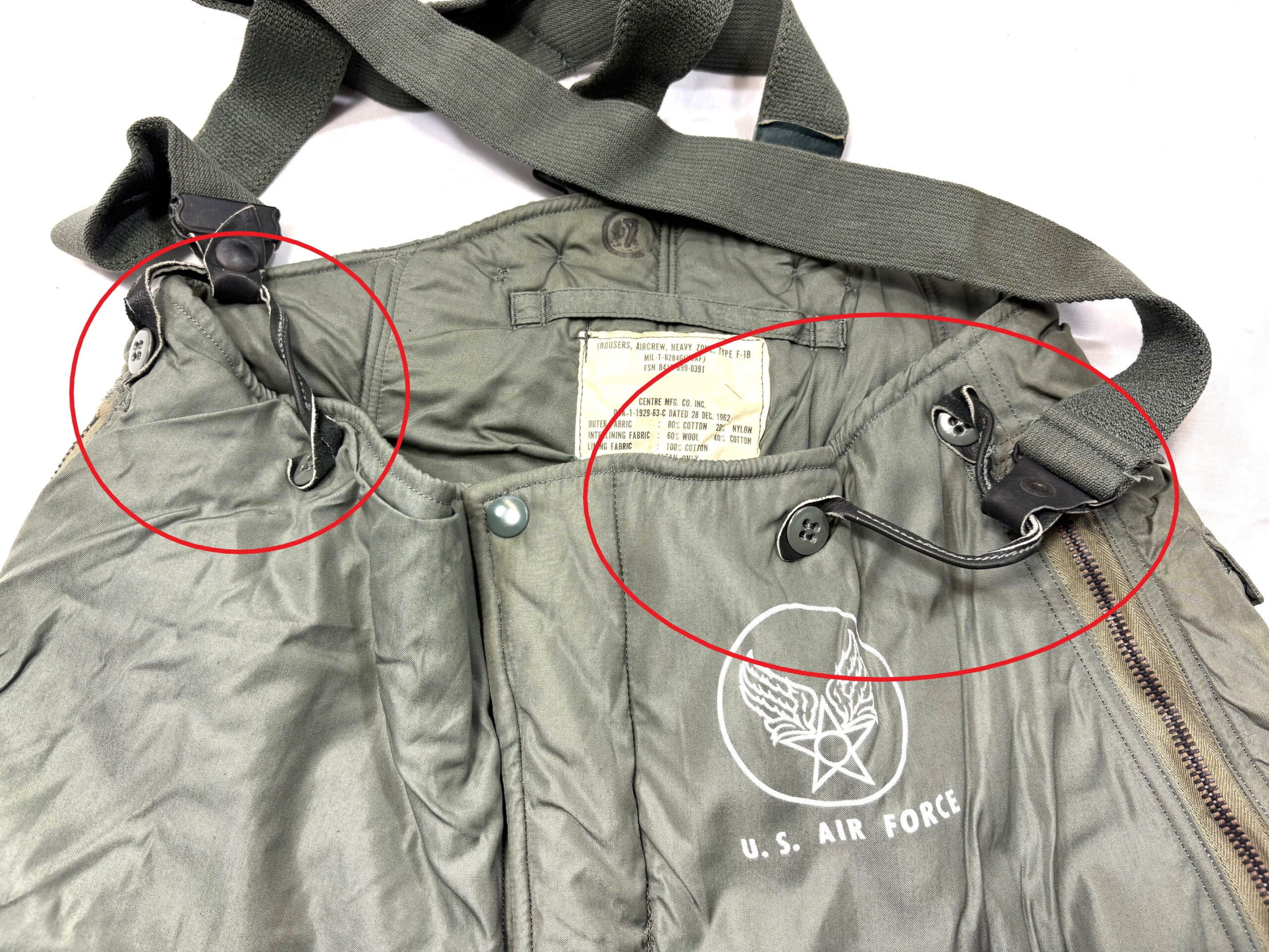 F1B flight trousers aircrew heavy zone original suspenders for “fat boy” pants. USAF Sage Green (grey)