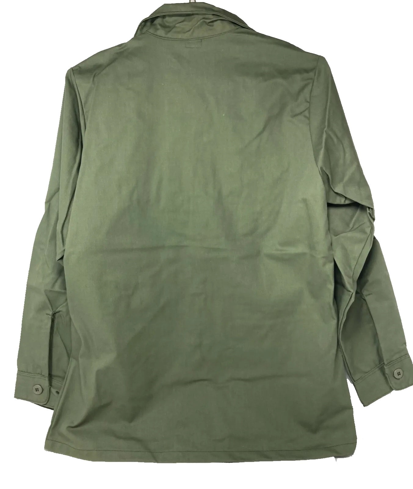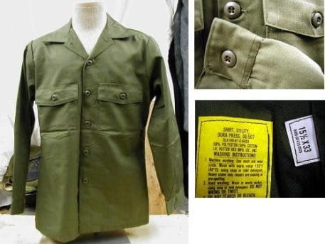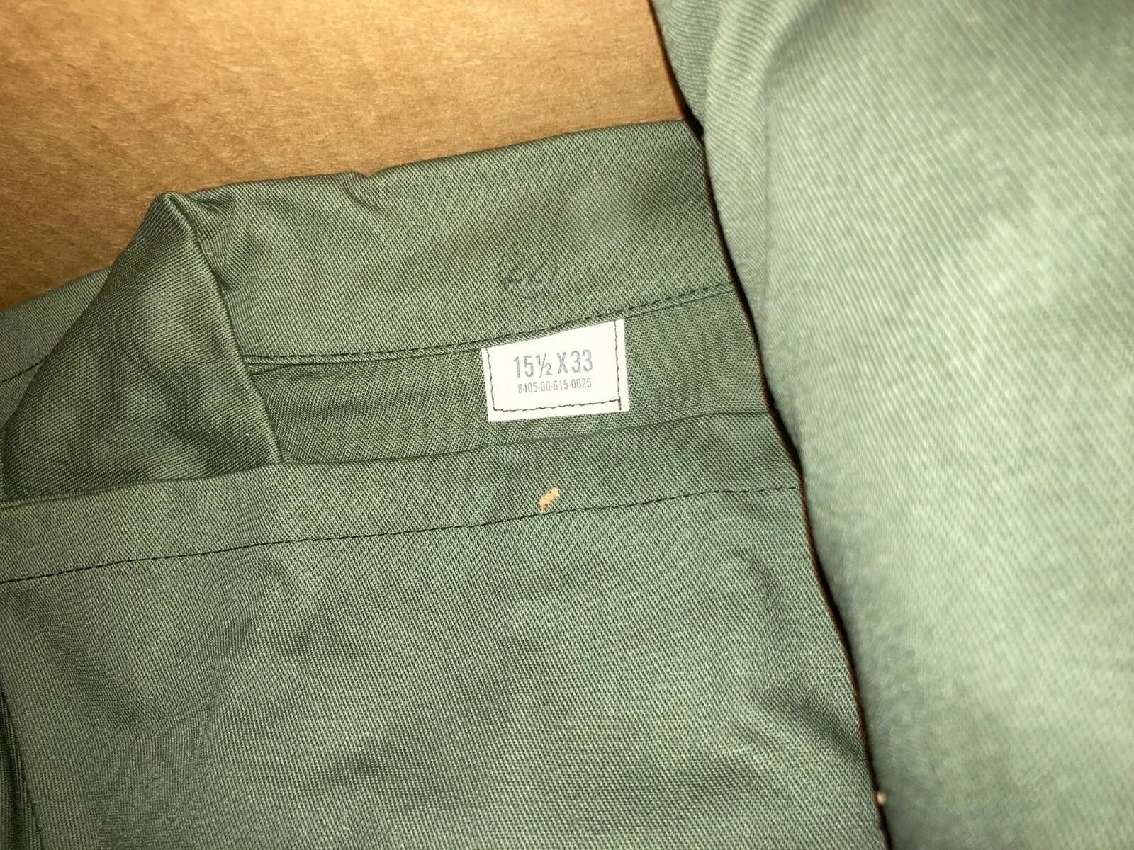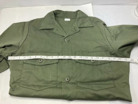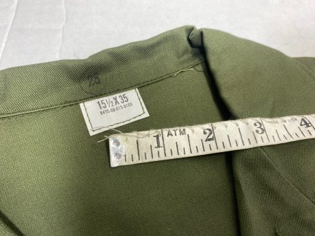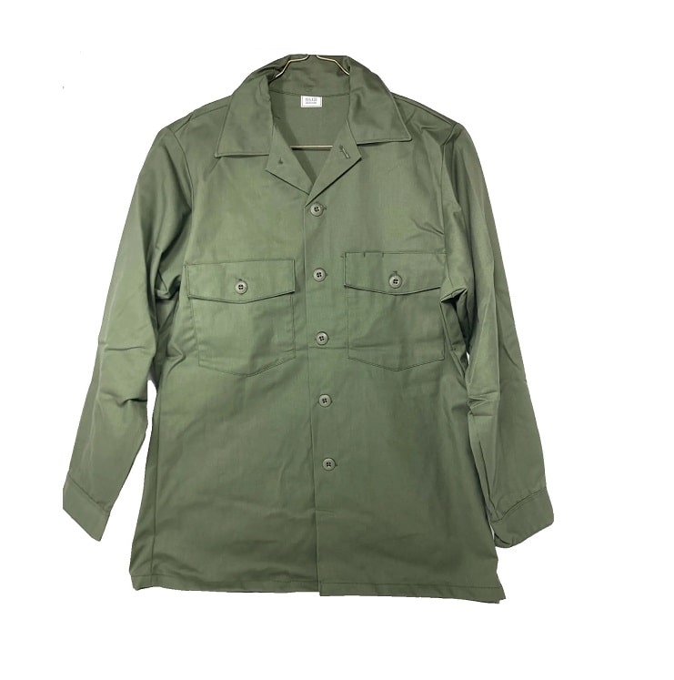 The 2-pocket shirt, olive drab. All original new surplus. OG-507 Measurement is by neck size (15 1/2) and neck to sleeve length, 33 inches or 35 inches. Armpit to armpit about 21 1/2 to 22 inches. Approx.
