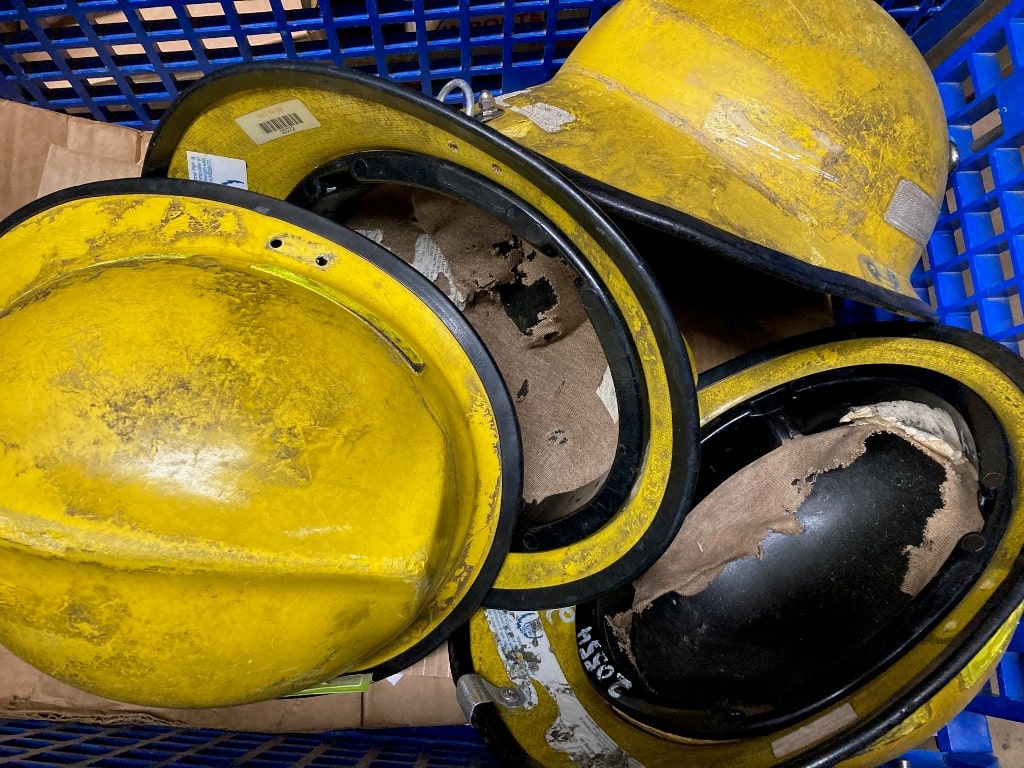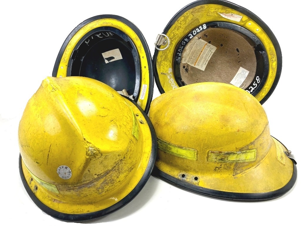 Used and abused firefighter helmets. Expect scratches, missing pieces, discolorations, no guts.