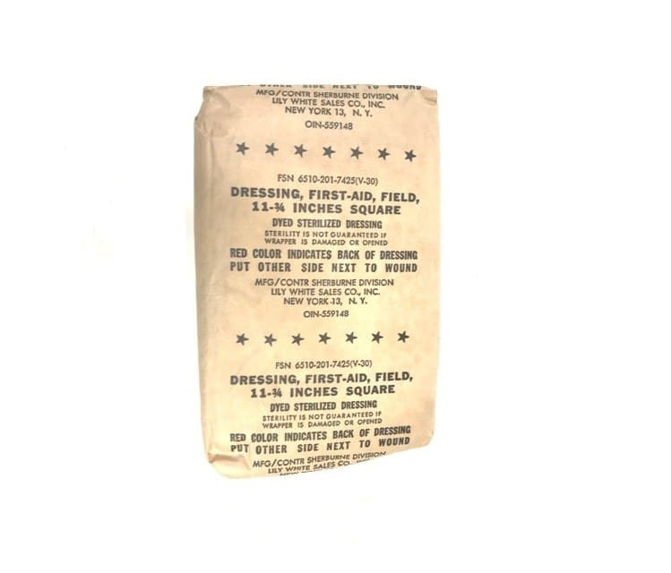 Cold War surplus; used in the large emergency aid kits. Still sealed in the original wrapper. 11 3/4″ square