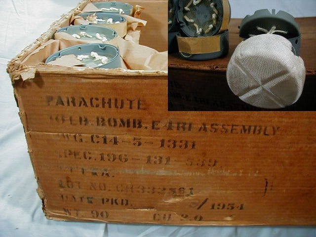 Flare/bomb parachute. Small parachute for 10lb. bomb. New old stock, packed in 1954.