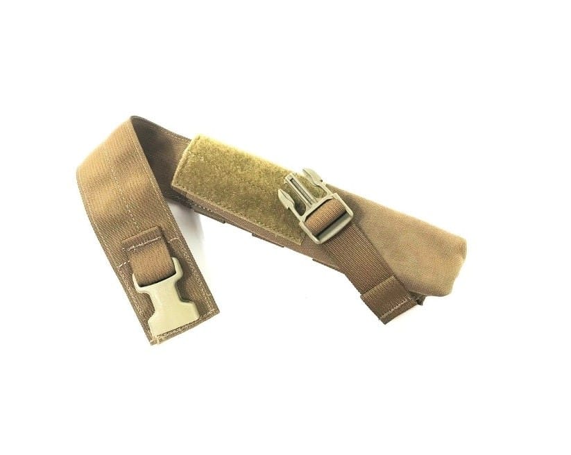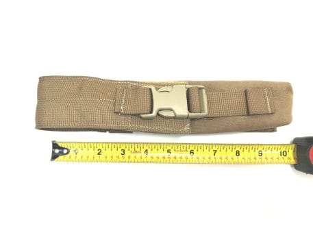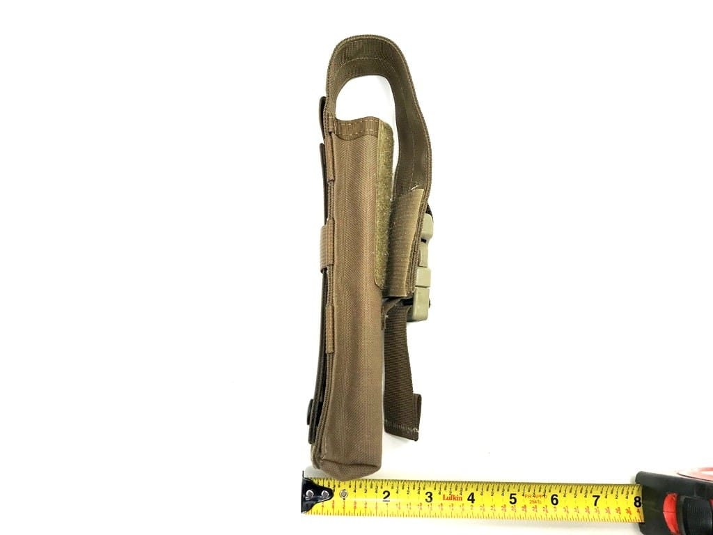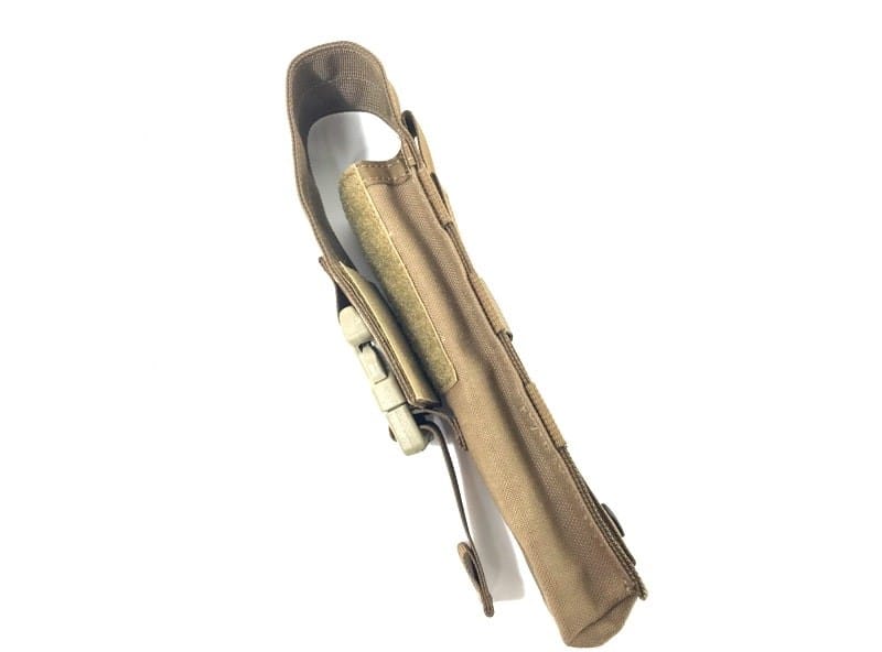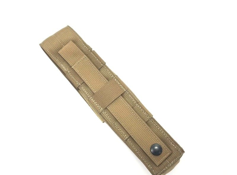 US made coyote single flare pouch with hook and loop and buckle closure. Molle attachment. Approx dimensions 11 x 2.75 x 2.75