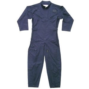 Reproduction Flightsuit, coveralls. Made of 45% polyester, 55% cotton. Many storage pockets. Zip Front. Hook and loop adjustable waist and cuff tabs. Fits one size larger than indicated.