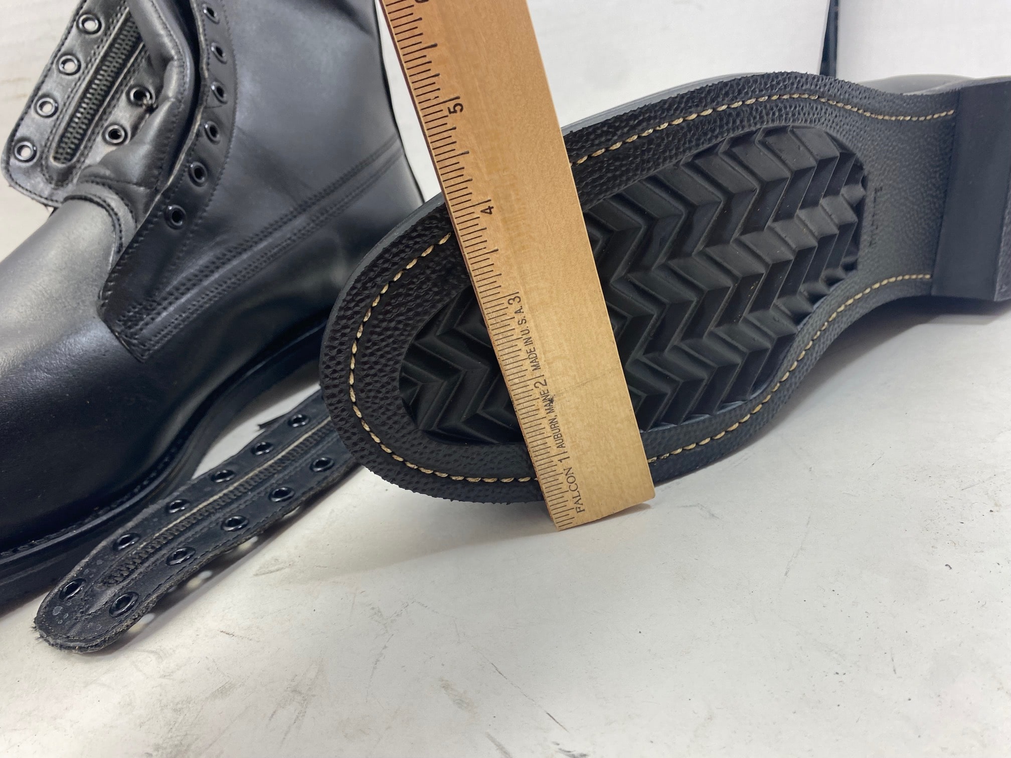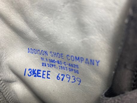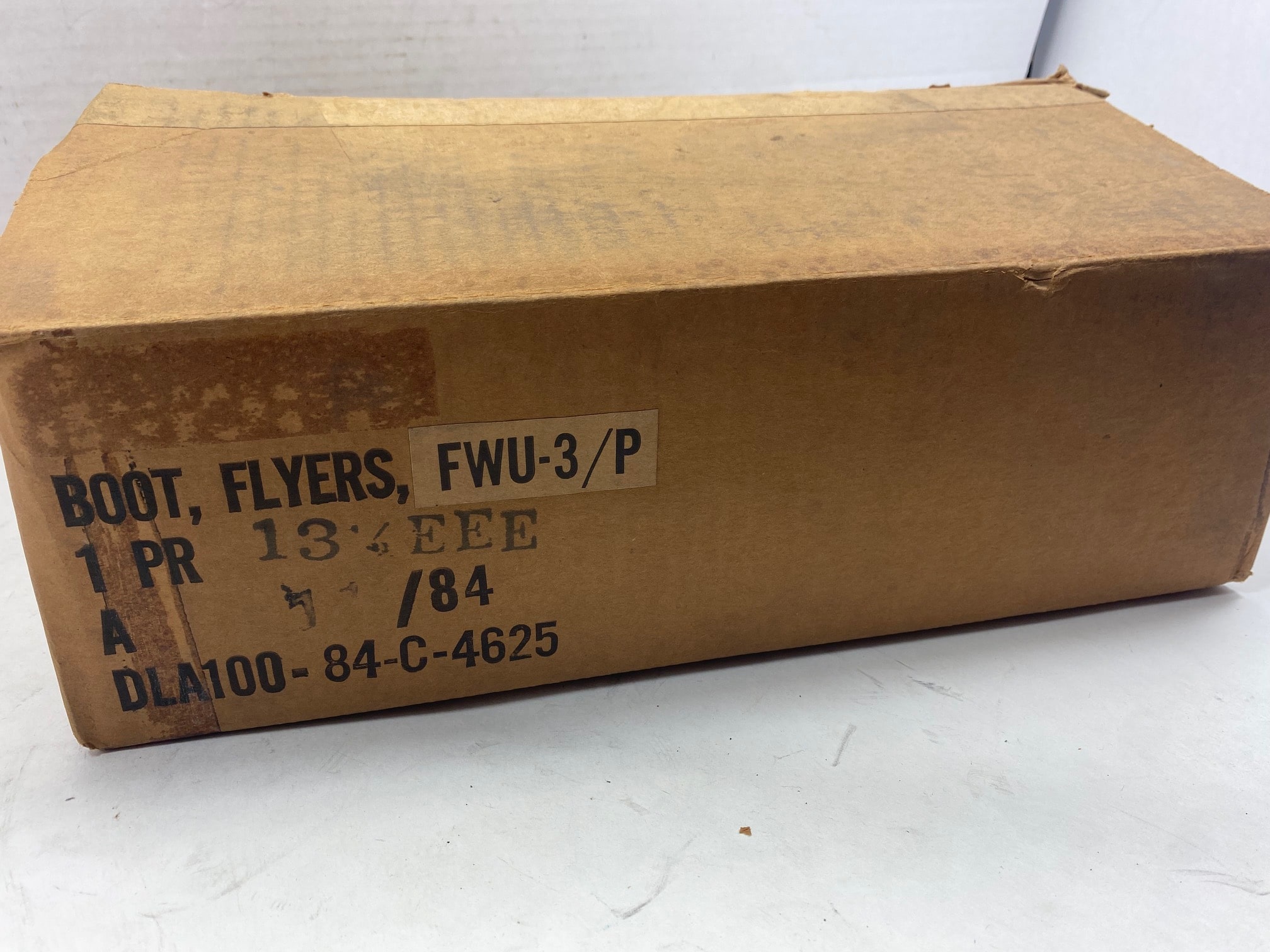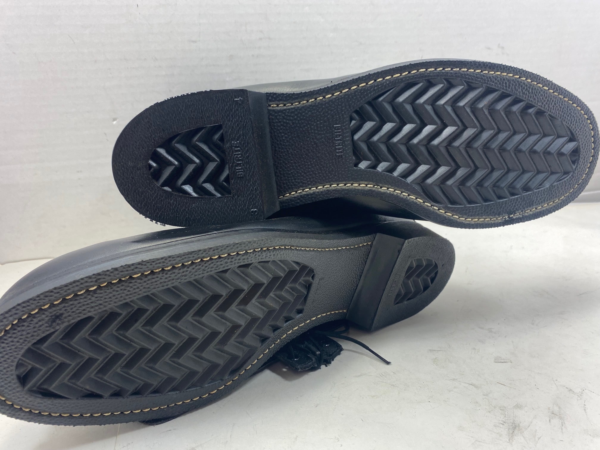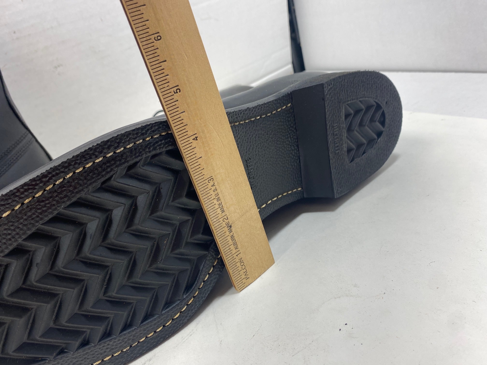 New, old stock. Flat heavy safety sole. All size 13 1/2 EEE, which translates to XTRA XTRA WIDE in width of foot. 1984 dated. Comes complete with zipper tie ins.