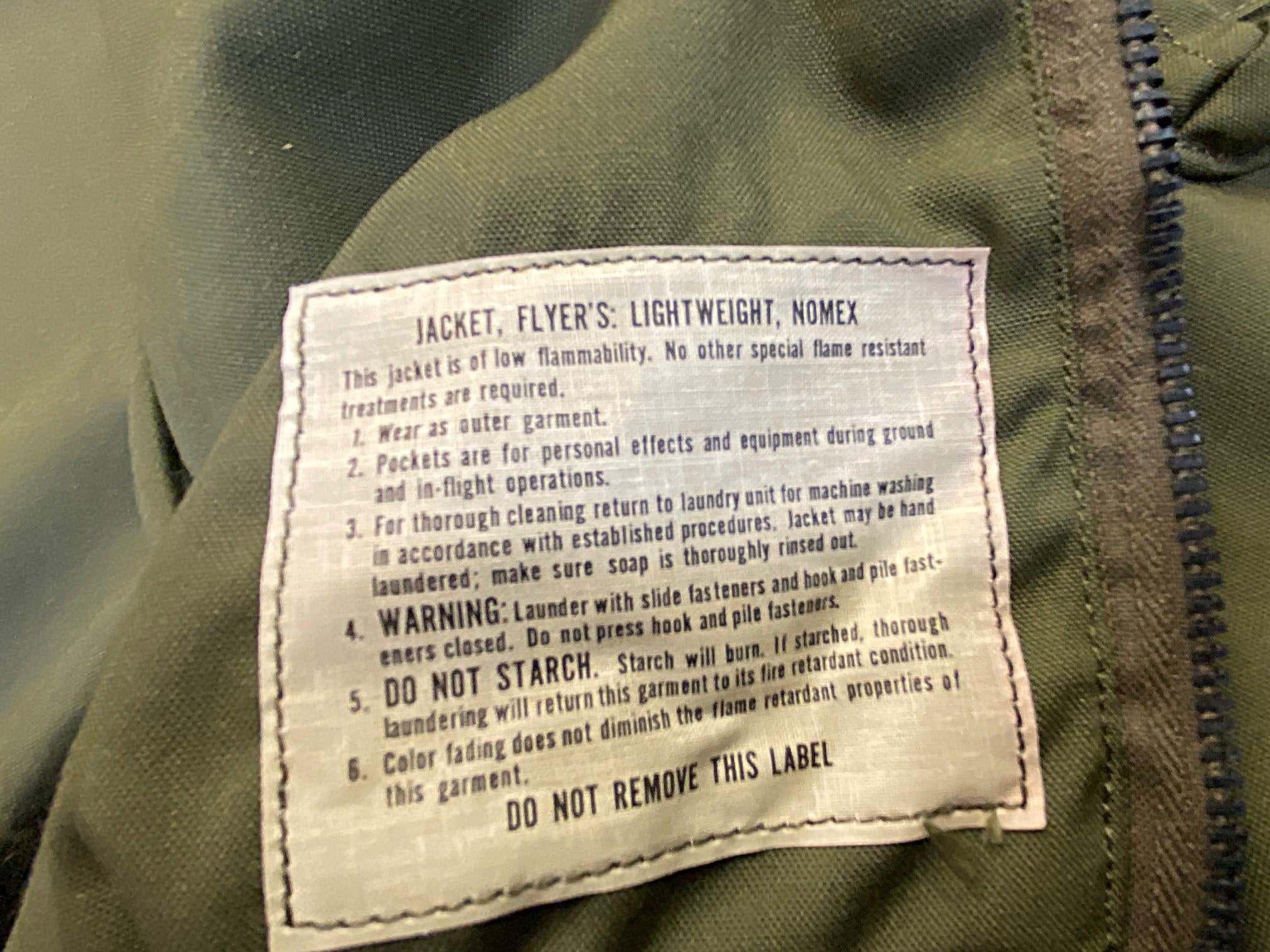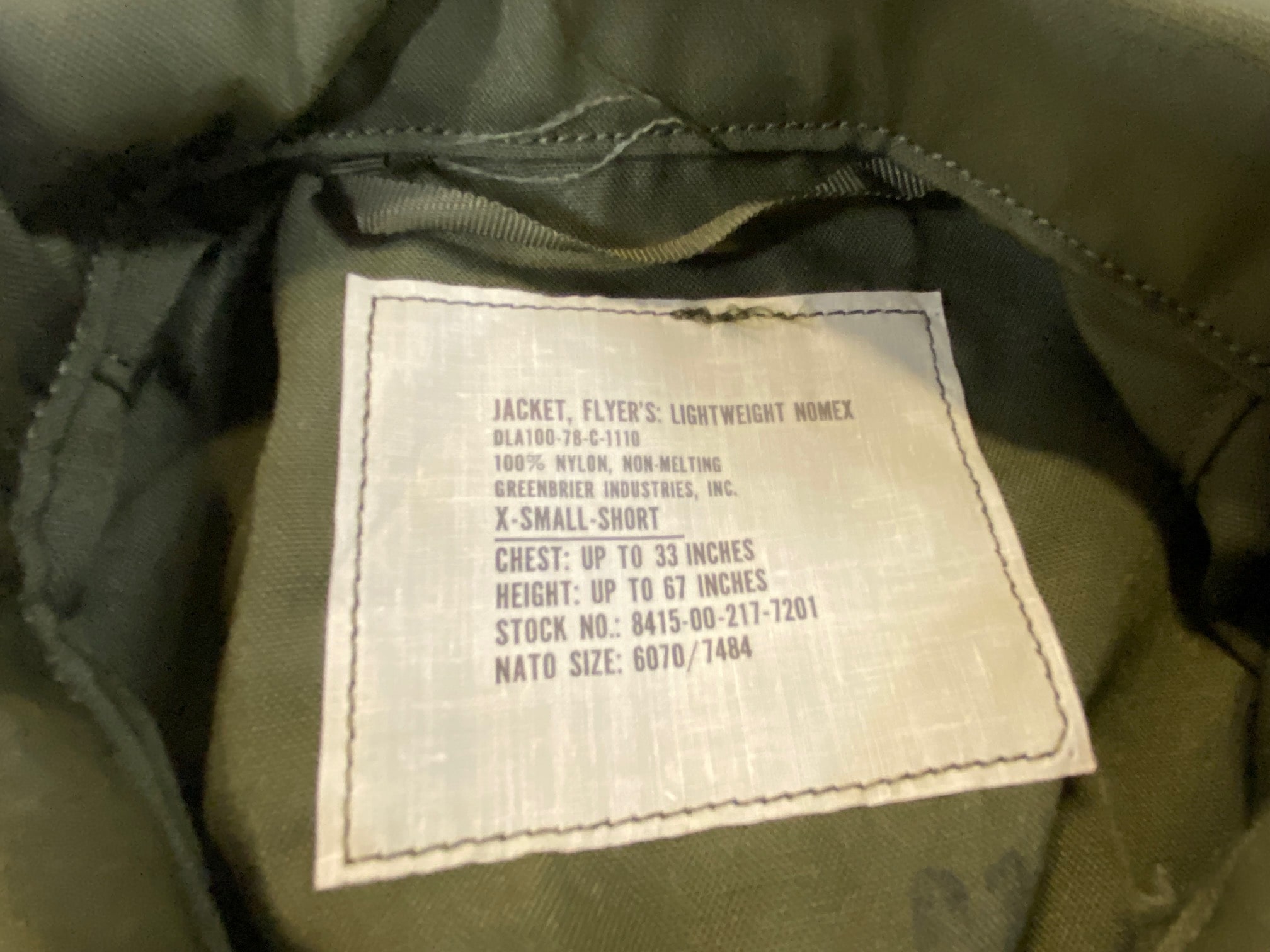 Post Vietnam era 100% Nomex Nylon -non melting flyers Jacket. Made by Greenbrier Industries. SIZE X-SMALL SHORT. New old stock.