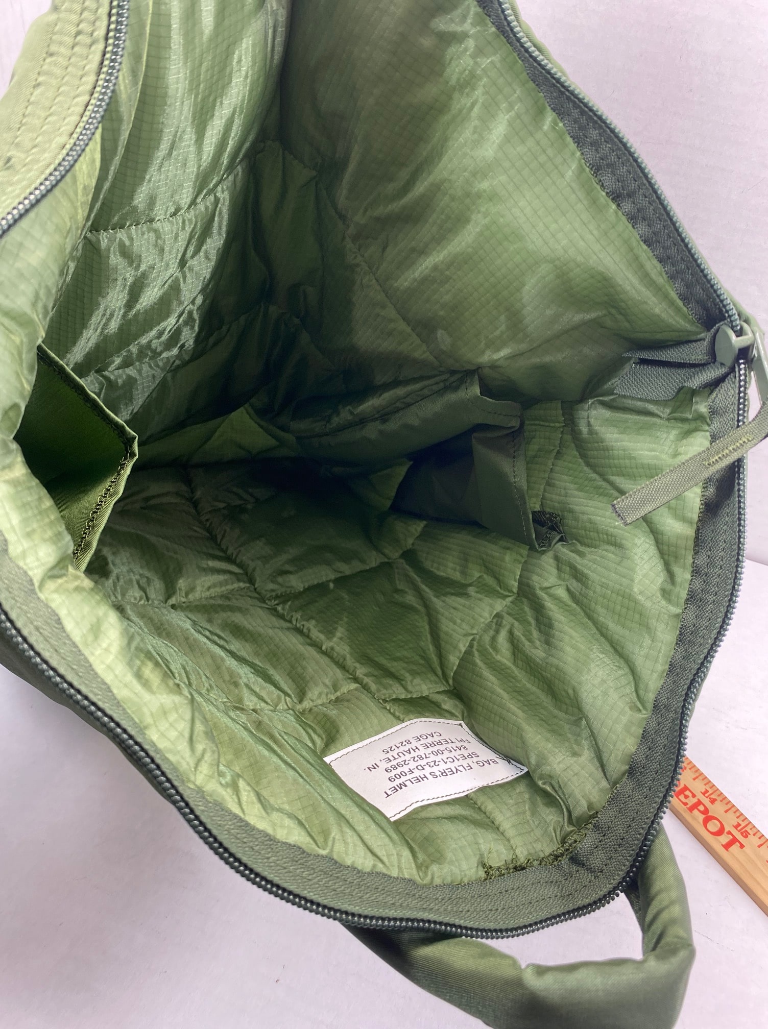 Flyers helmet bag, pilot helmet bag. Padded nylon construction with plastic zipper. Features 2 exterior pockets with hook and loop/ button closures. 20″ x 20″. New. Everyone calls this the “helmet bag”. MADE BY UNICOR