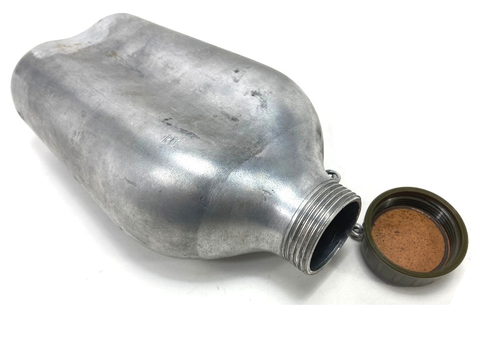 Original French Aluminum Canteen with 1 liter capacity and plastic rubber-gasket lid. These come out of heavy wooden crates dated 1952.