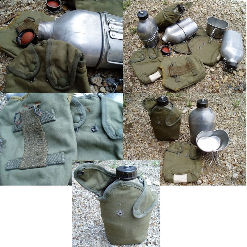 Includes aluminum canteen with cap lanyard chain, olive green/khaki mix canvas cover with wire hanger, and aluminum cup with folding handles. Used in good condition, with some scratches, dings, stains, and patina from long term storage. *Styles of canteen covers and caps will vary.