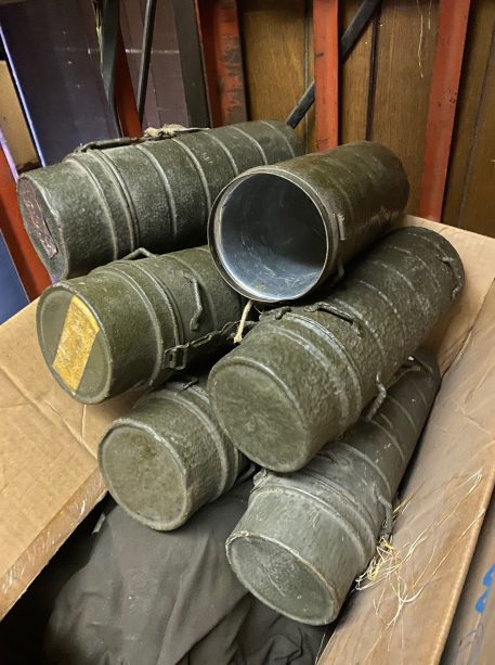 A protective carrier for the old style West German gas masks. These containers are Aluminum lined, steel outer is 4″ diam. x 13″ long. Features include gasket sealed lid, spring latch for secure closure, and a special compartment in the top of the lid for extra lenses. Used-good condition. Looks very similar to the German World War 2 container, these were issued in the late 1960’s and early 70’s.