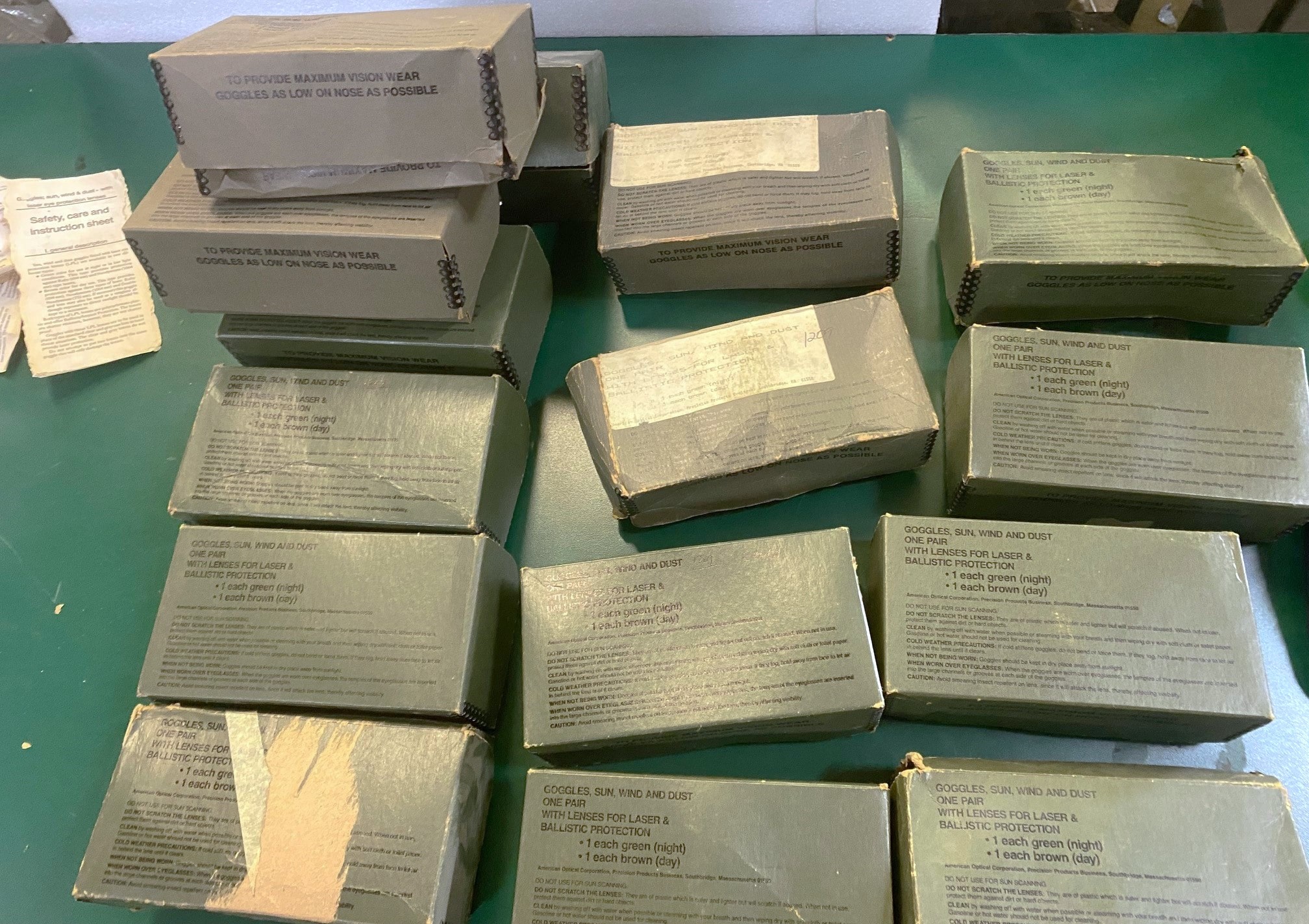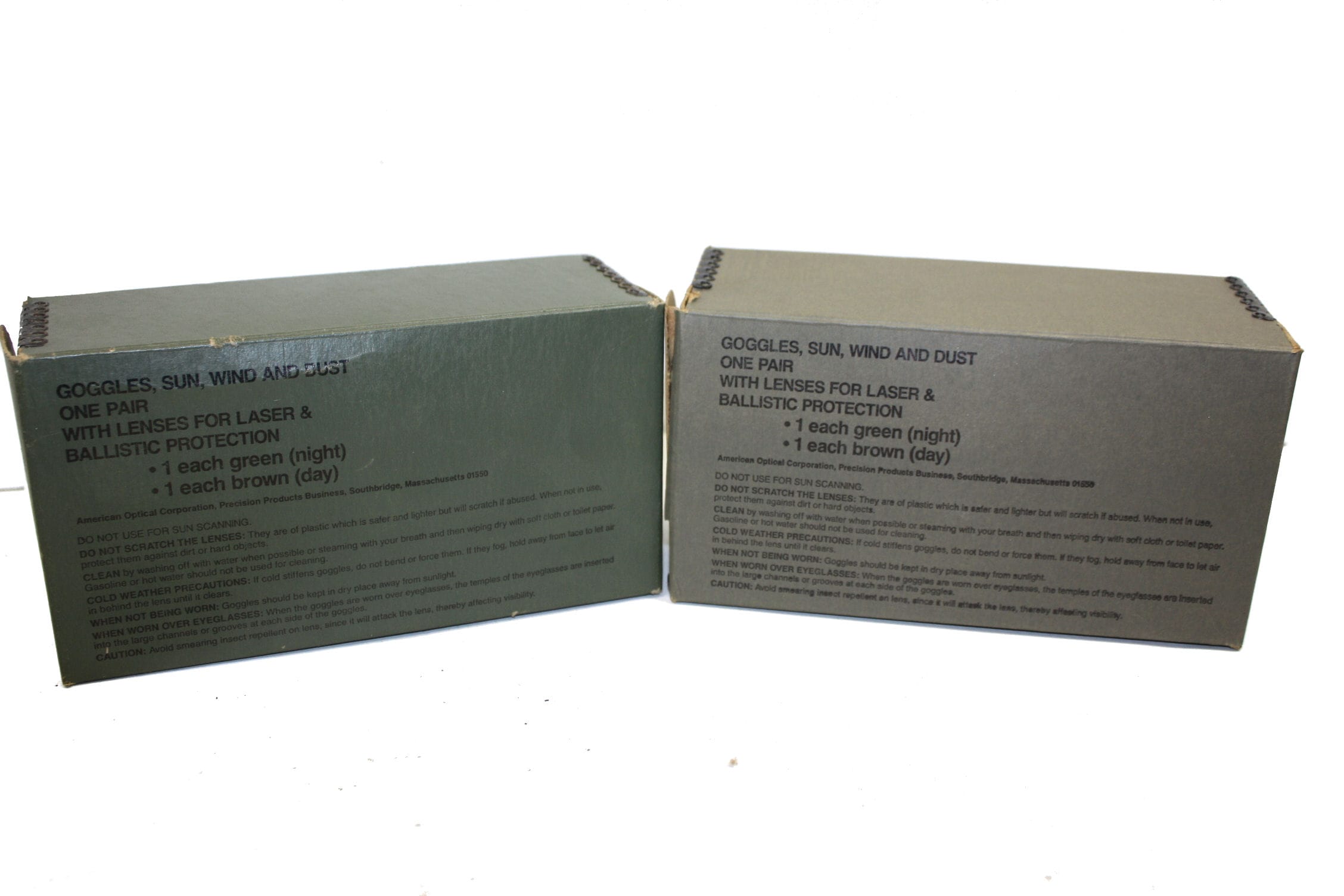 Come complete with green (night) and brown amber (day) lenses. Can also be worn over glasses if necessary. The US military used this tanker goggle for ground and flying aviator air troops from the 1940’s to present. New old stock in box. *BUYER BEWARE* From age, the seal on the foam cushion inside of the goggle MAY deteriorate and will flake off…***