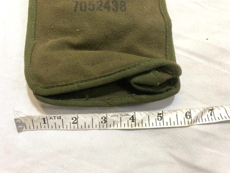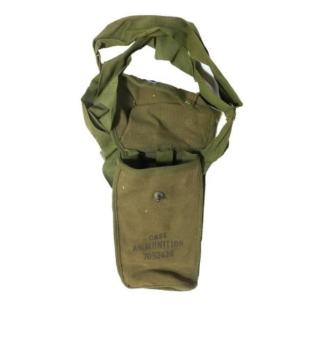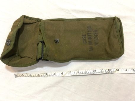 US Vietnam War era heavy canvas olive green, 30 round clip pouches. These 45 caliber machine gun clip pouches are for the grease gun. They are approximately 3″ x 5″ x 1 1/2″ with shoulder strap, has interior web pull up straps to retrieve the clips. Have been sitting in warehouse for a long time, some stains from storage. New old stock.