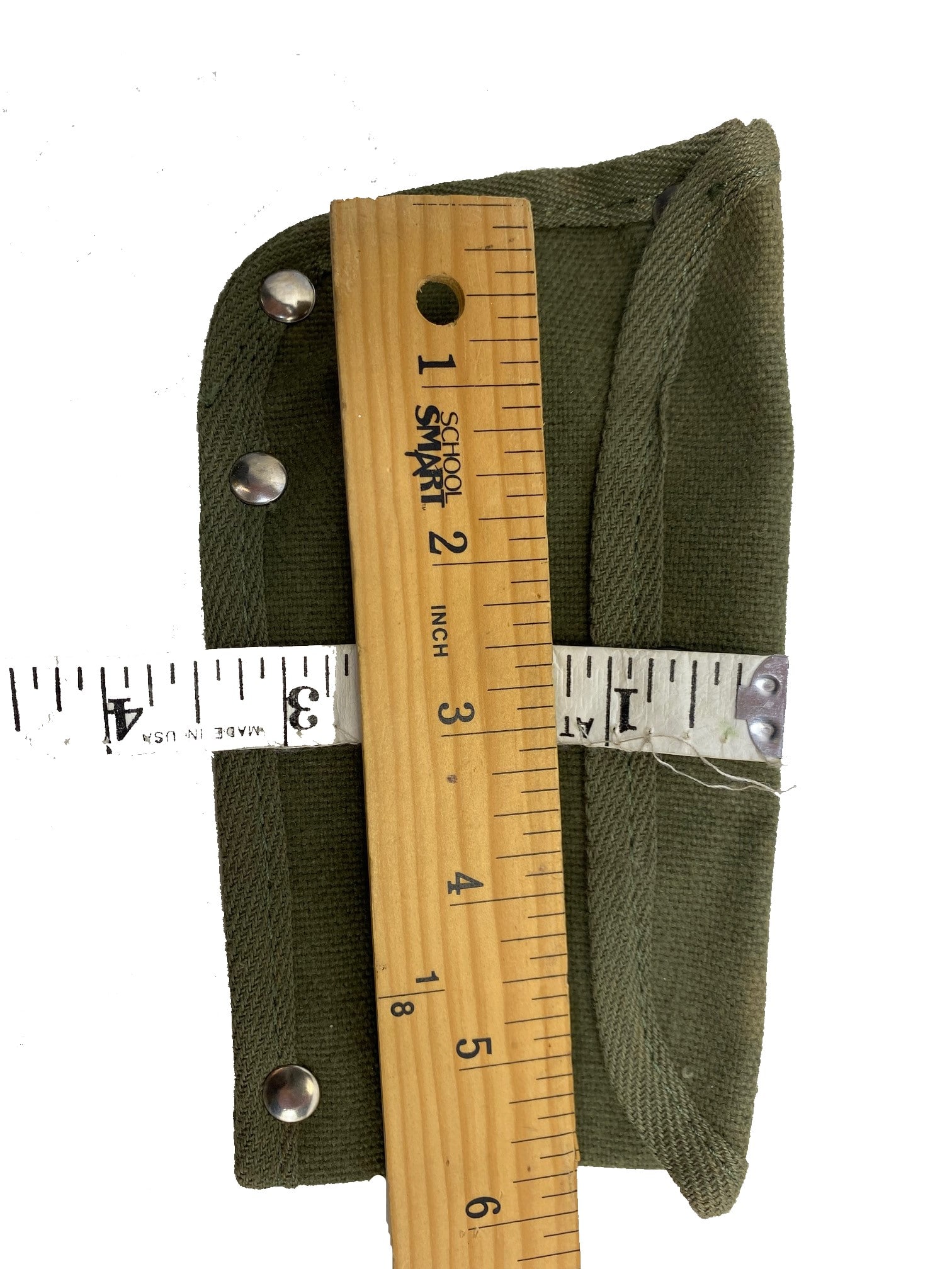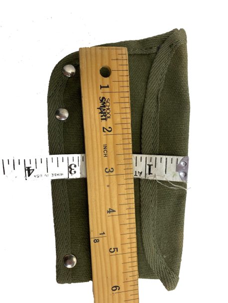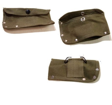 Hatchet cover, cotton canvas pouch with hook attachment. Commercial reproduction made in Japan surplus stocks from the 70’s. Fair condition, good used