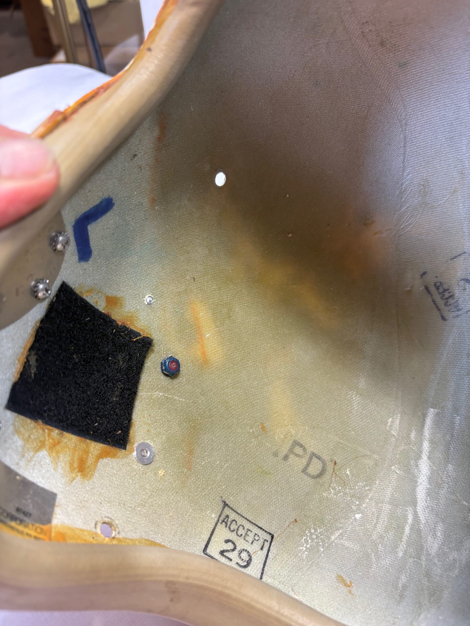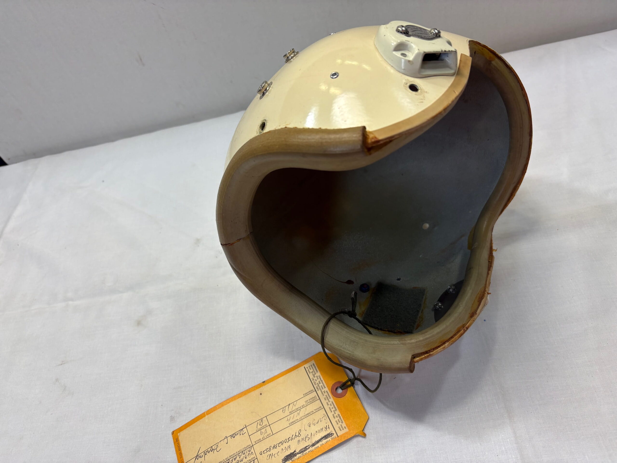 Hgu-22P flight helmet shell gutted of all components with the bayonet receivers still on. Thicker style shell with thick edge roll. Demil tags this as HGU-22 LARGE.