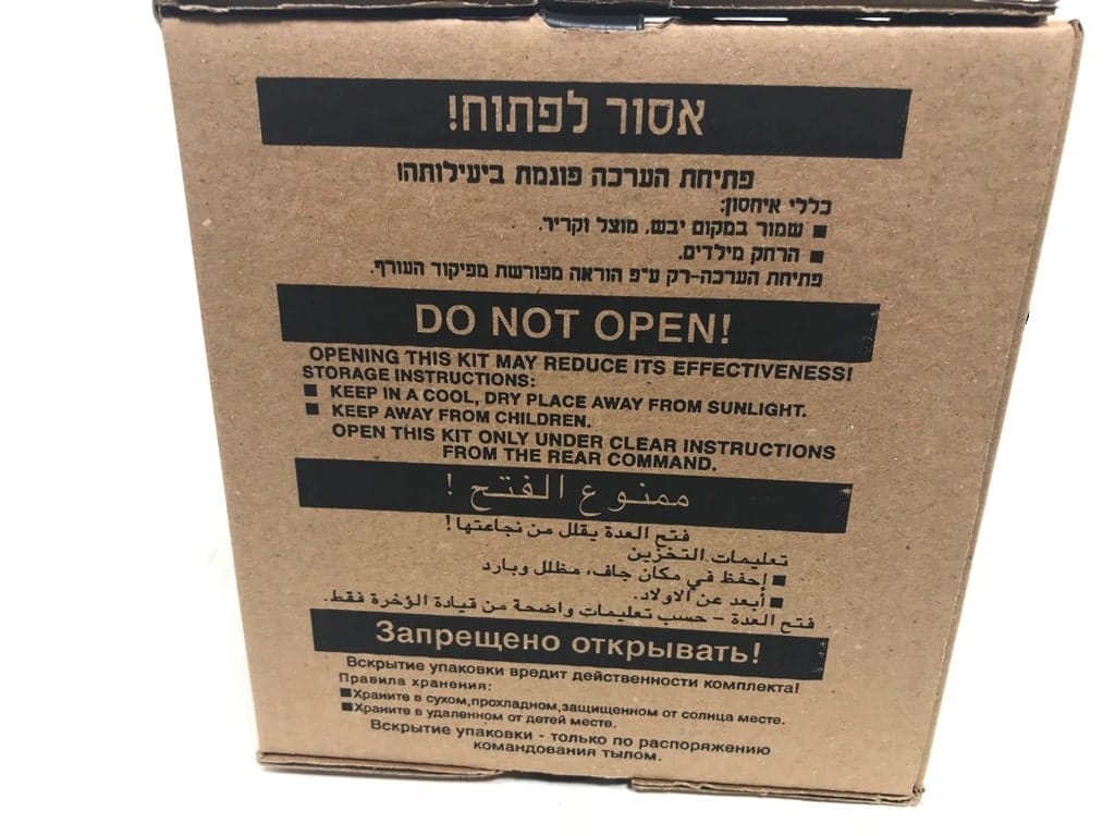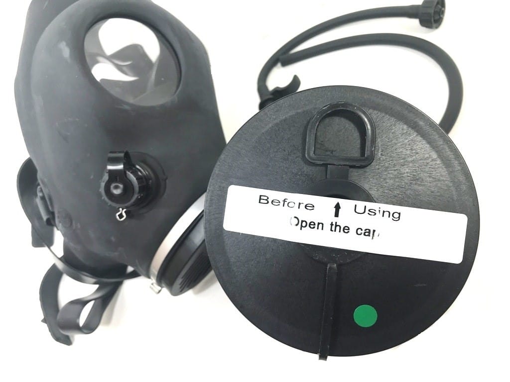 Issued to Israelis when threatened with chemical attack. Mask is new, unissued condition and has hydration port with drinking straw.