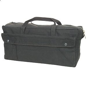 Larger sized tool bag to hold and organize a variety of tools. Similar to Tanker’s bag but with hard bottom. 7″ x 9″ x 19″. Black cotton canvas with carry handles and outer pockets.
