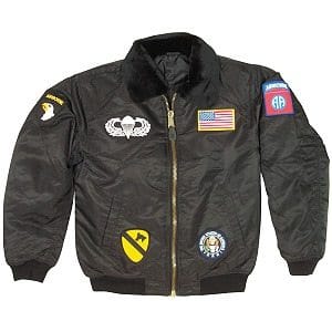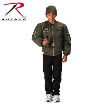 Import copy of the famous MA-1 nylon military flight jacket in a kids size. Comes with various patch arrangements that could vary from the one pictured. Black insulated flyers jacket. Kids sizes Small thru XL.