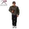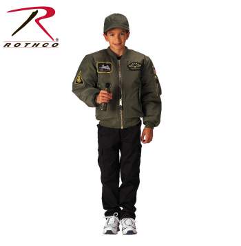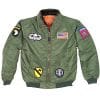 Import copy of the famous MA-1 nylon military flight jacket in kids size. Comes with various patch arrangements that could vary from the one pictured. Sage green insulated flyers jacket. Kids sizes Small thru XL.