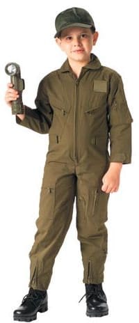 Youth size aviator flight suit. Army Green, no patches. Children’s version of the Air Force pilot suit. Cotton / poly blend perfect for costume or more. New import, various sizes.