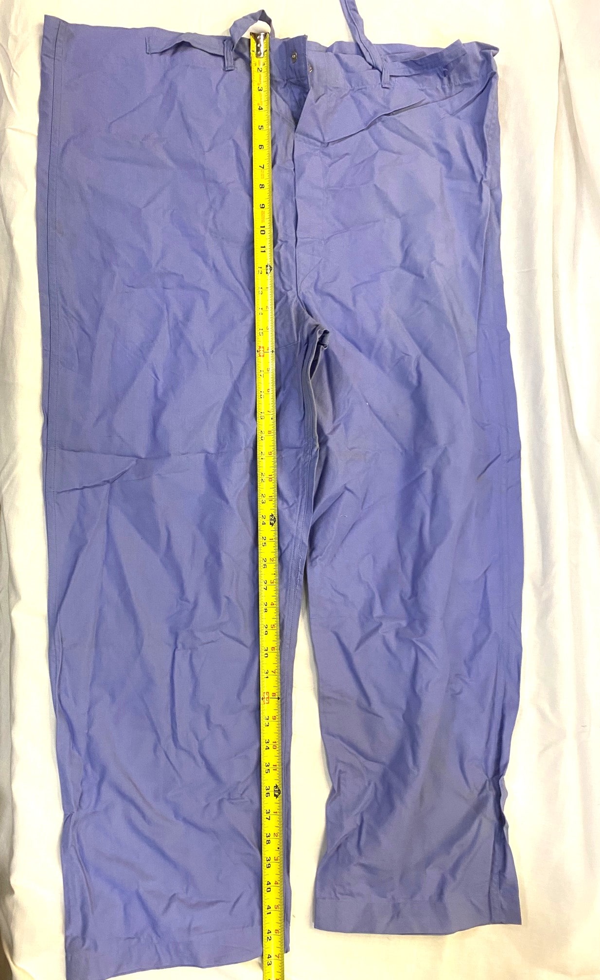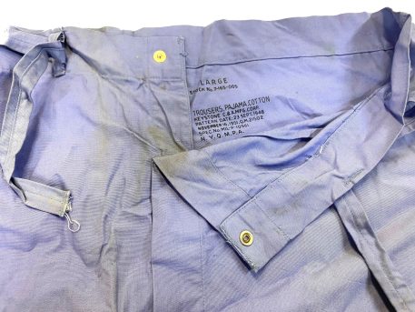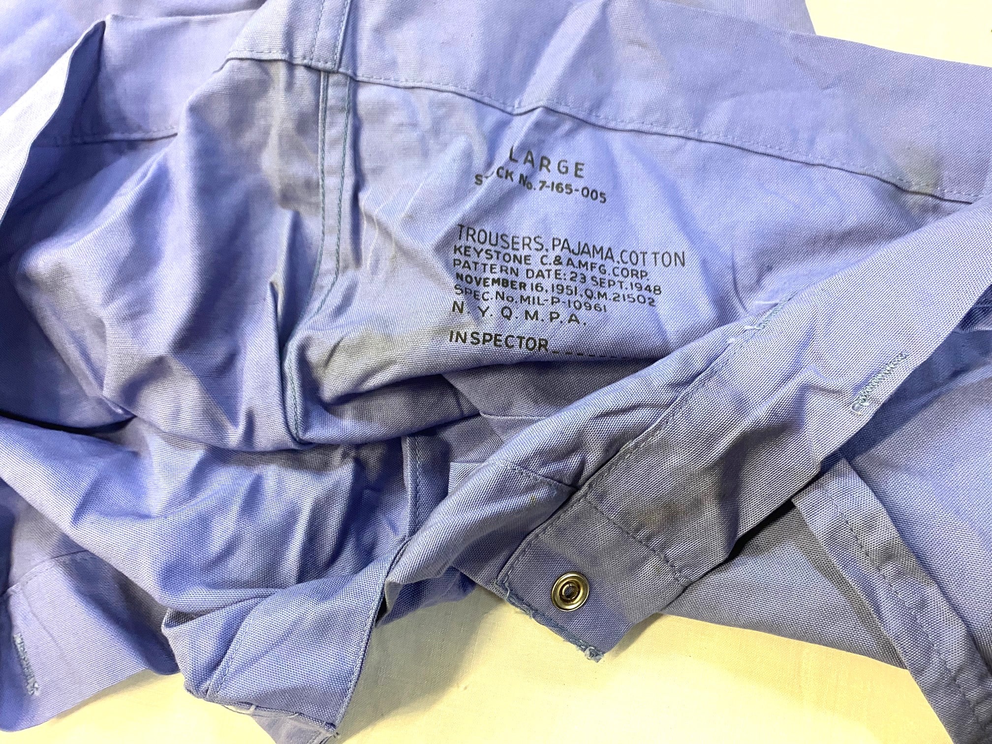 Korea War dated Blue cotton lightweight pajama trousers with minor stains from packaging and storage. (see photos) Size LARGE only. New old stock.