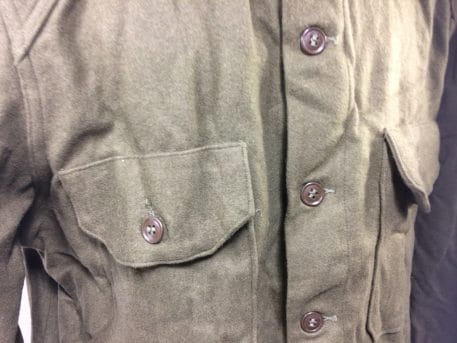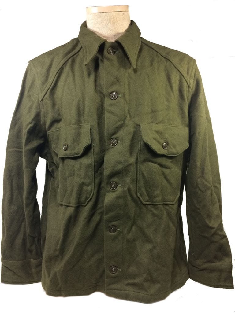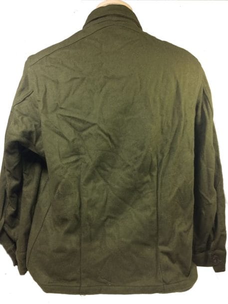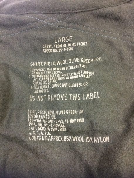 U.S. G.I. Korean wool field shirt. Wool. New old stock, with minor shelf wear. Size Large (42-44 chest). Will not fit big bellies. If you have a 42-44 chest, but over a 40″ waist, these will not fit