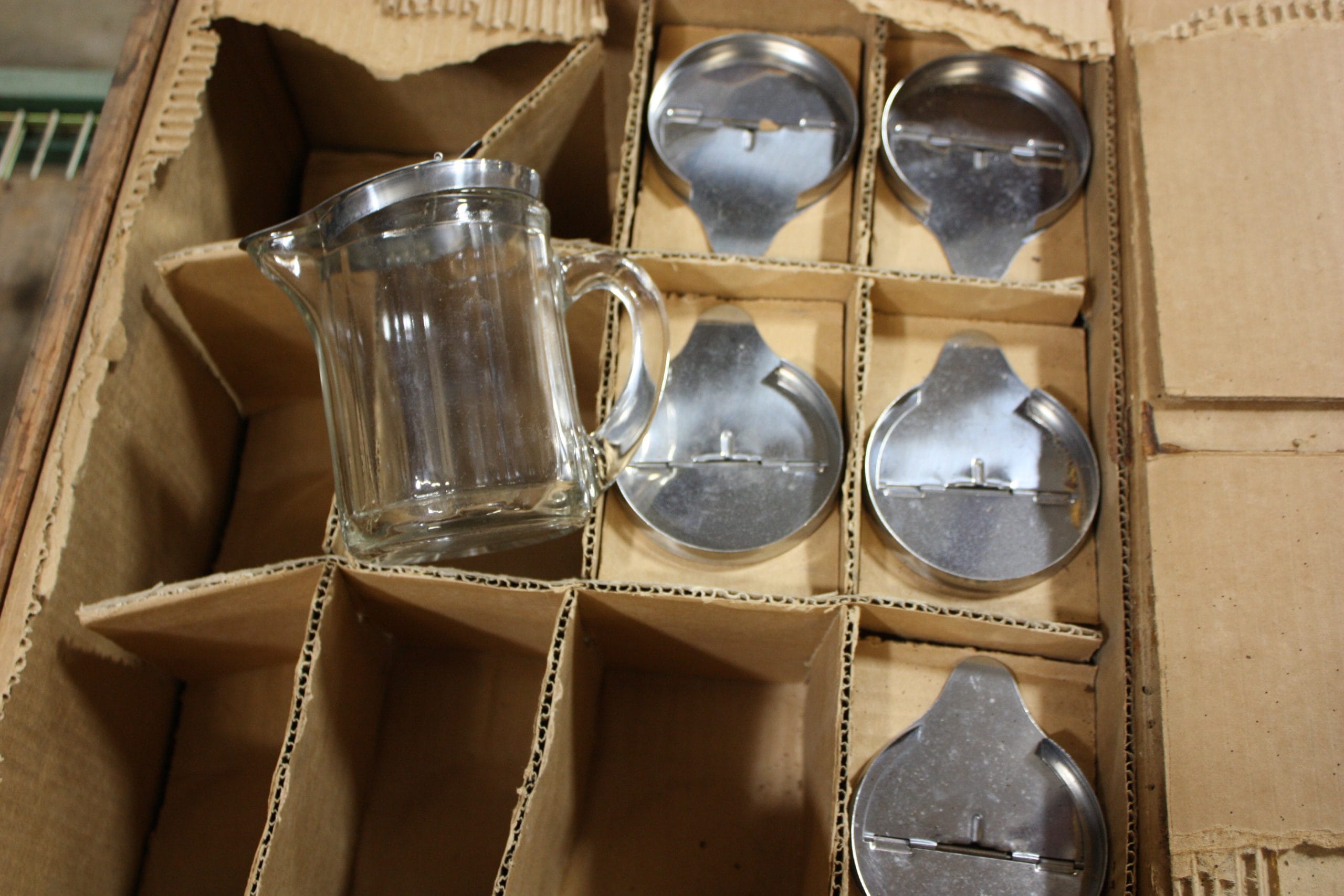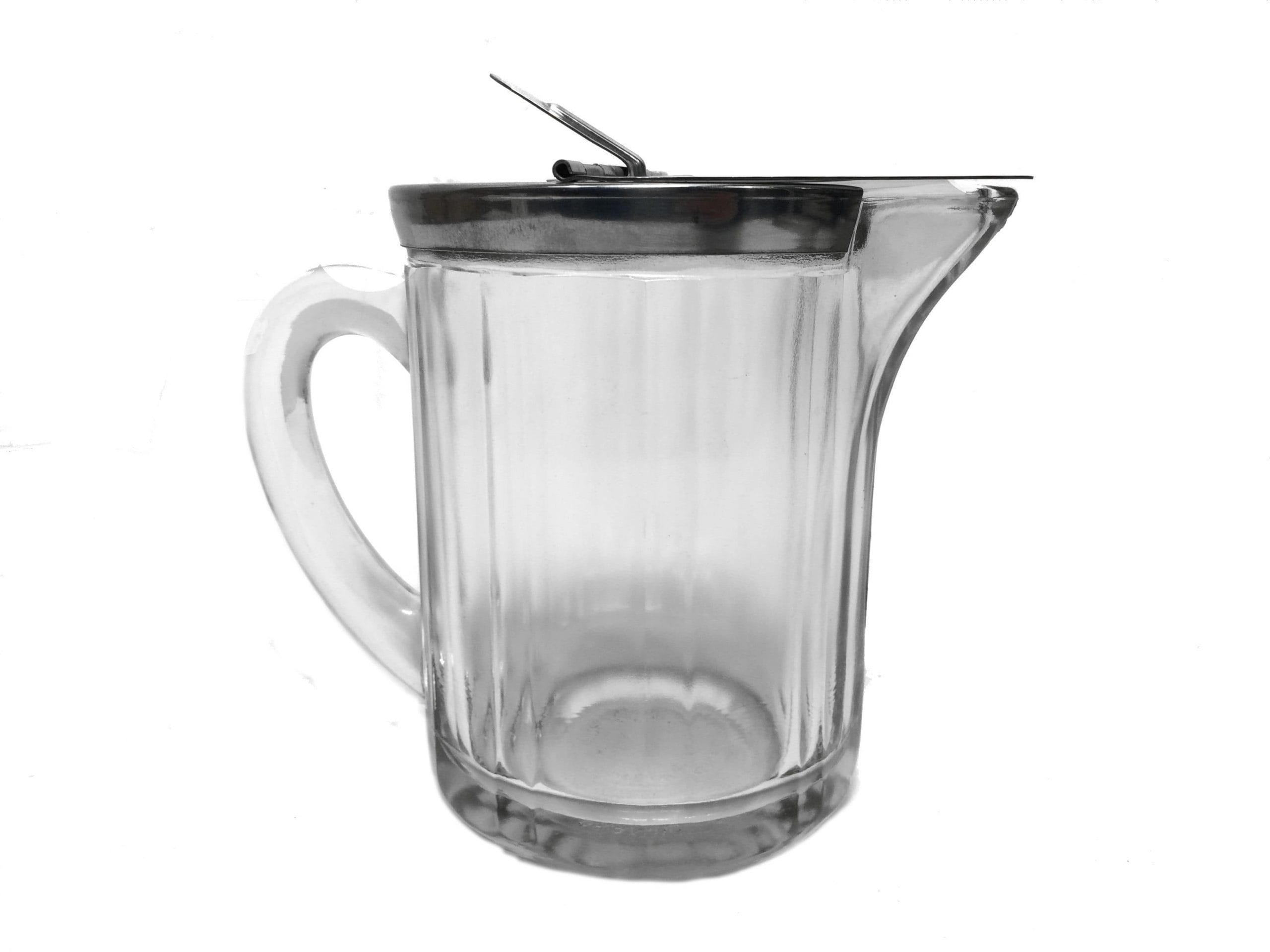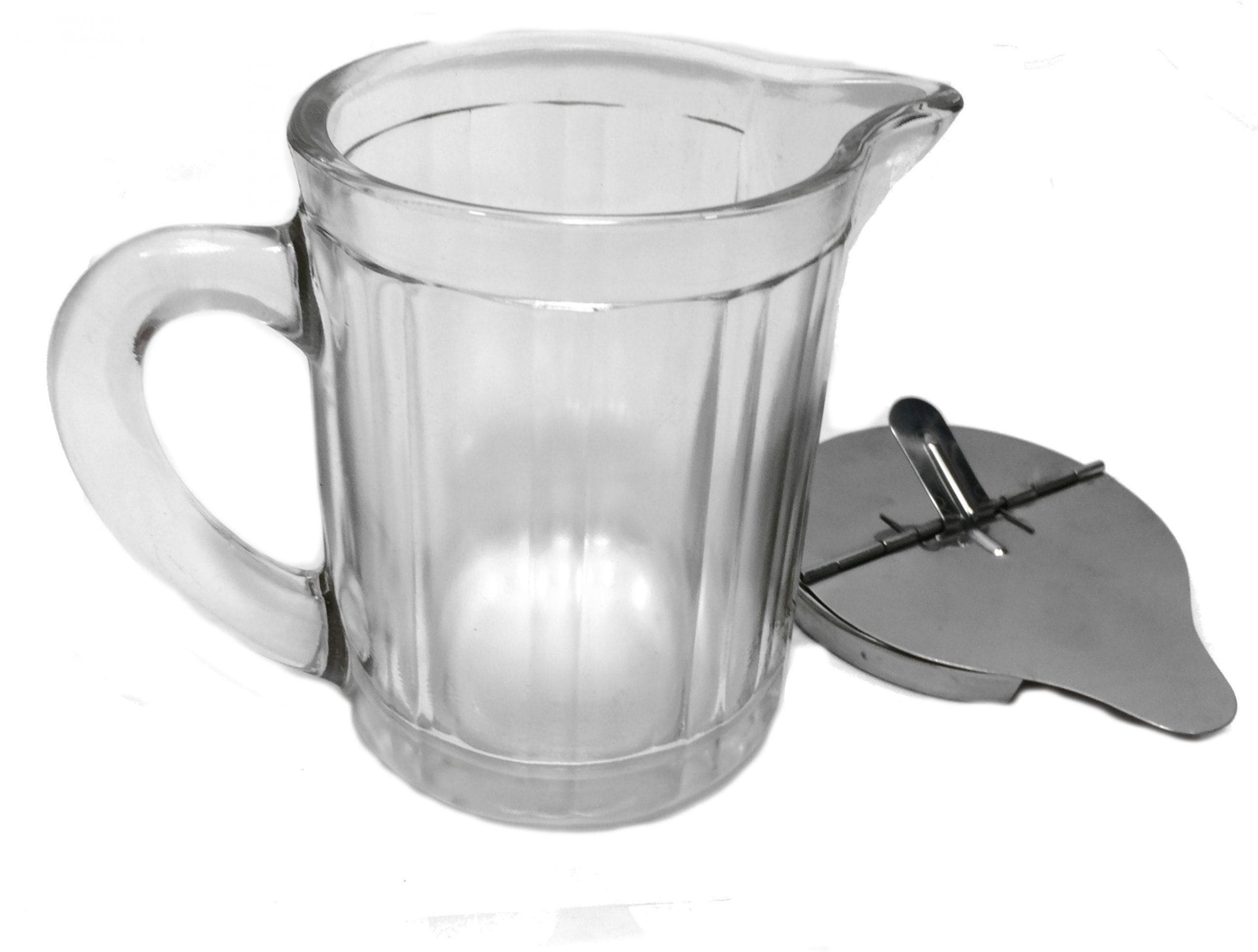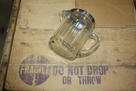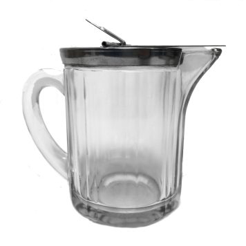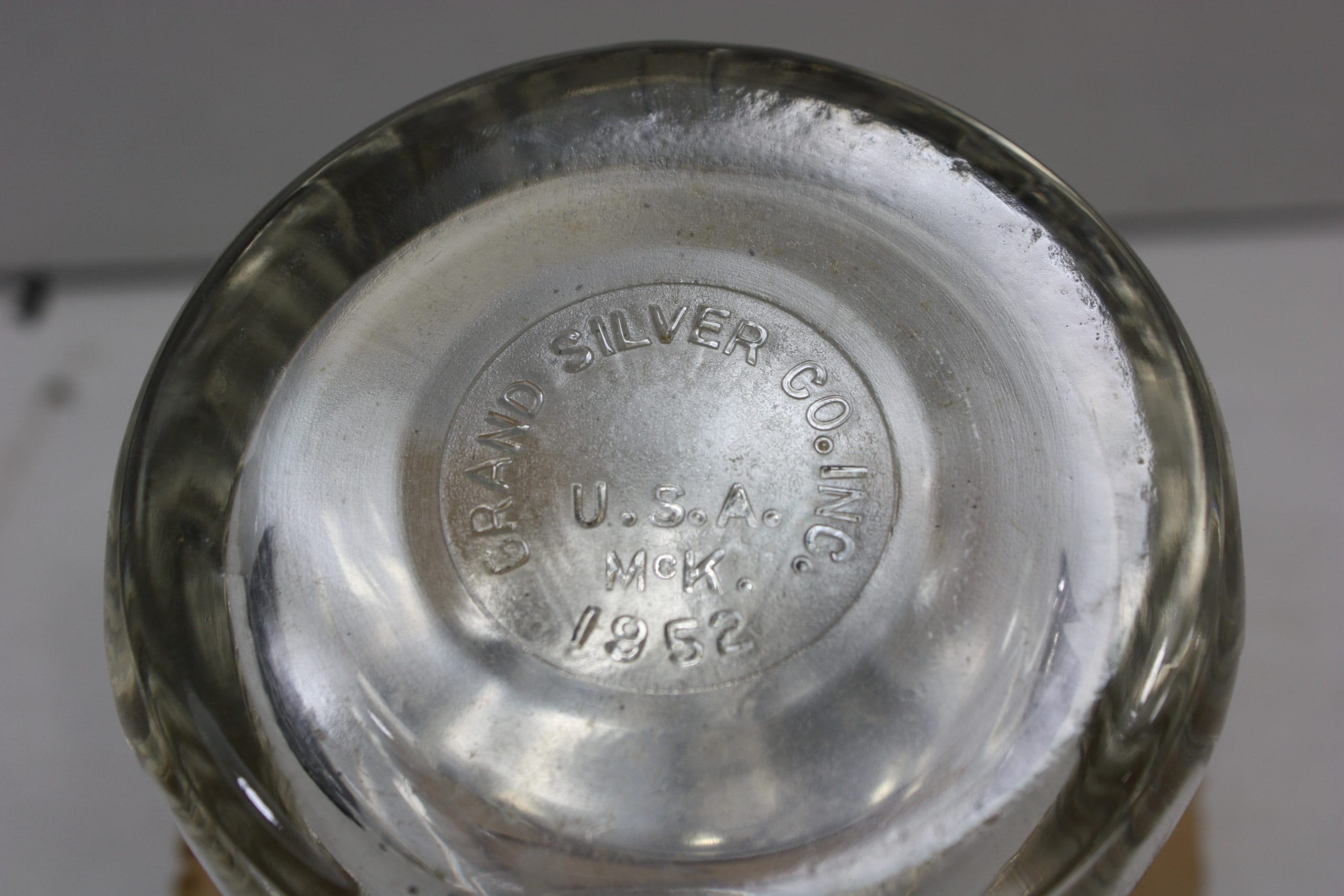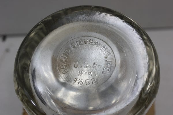 1950’s dated and stamped on this heavy-duty glass pitcher. Features stainless steel flip-top lid, which can be removed. 3″ dia. x 5″ tall. Wt. 2 lbs. These are beautiful. They are handy, collectible, and make a great gift. Buy a couple of ’em…You won’t be sorry. Original Navy surplus.