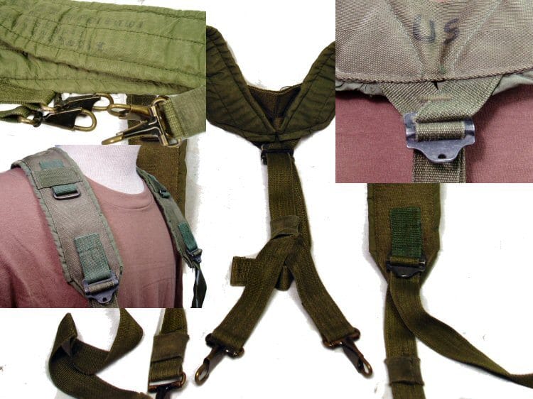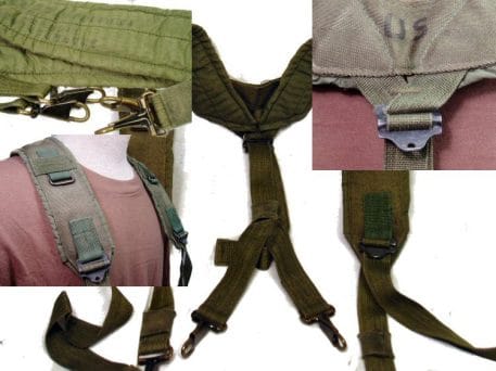 One of the essential components of the military load bearing system is the nylon “y” suspenders. This type was the LC-1 version used in the 1970’s through about 1995. The suspenders are hooked into the pistol belt to offer additional supprt for the heavy loads of water ammo and grenades