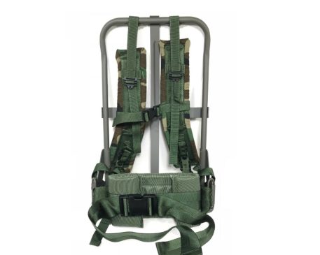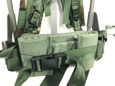 Genuine military issue back pack frame for the LC-2 Enhanced (commonly known as LC-3 Woodland) Alice rucksack. Complete frame with woodland straps, kidney waist pad, and waist belt.