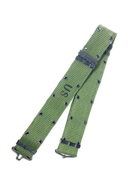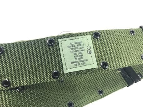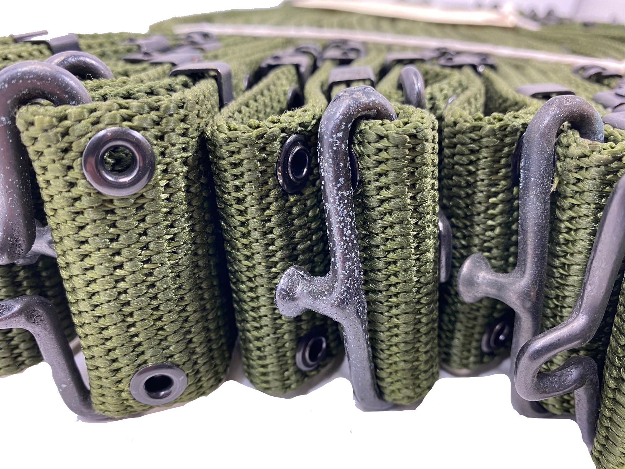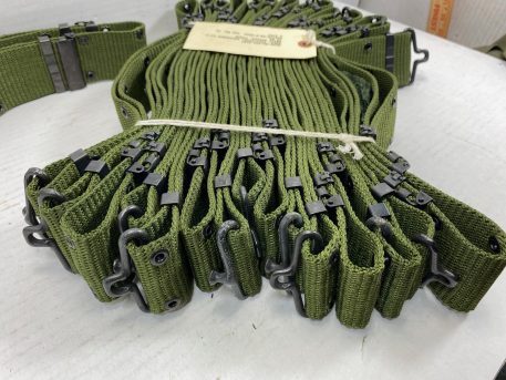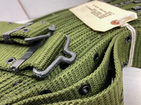 Perfect for the reenactor and a great size too. Large fits 34″ to 50″. New Mint condition. O.D. All original issue. The individual equipment belt is made of army shade no 7 olive nylon webbing with black metal buckles,keepers, and adjusting clamps. It is adjusted from each end by means of the clamps that swing open to allow the belt to slide through. the older belts from ww1-korea had hooks that clipped into holes in the middle of the belt. The equipment items are attached to the belt by either hooks through the holes or ALICE fasteners that slide all the way around the belt so that you can put items on without taking the belt off. The eyelets along the top of the belt allow for a soldier to clip in the suspenders to hold up the heavy belt that is loaded with ammo and canteens and first aid and other sustainment items or a butt pack. This is original issue NOS military surplus item and we will not have them forever.