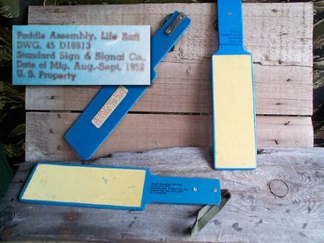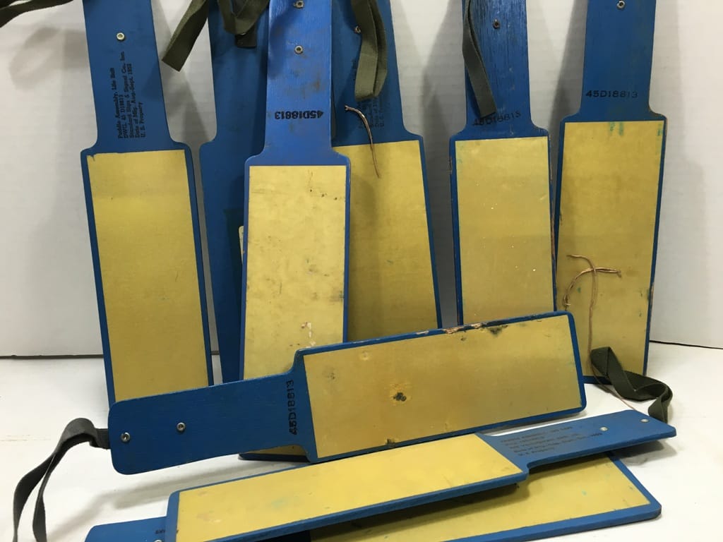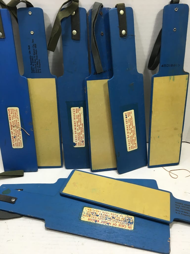 Military Pilot survial kit life raft emergency paddle, oar.These were found in part of the aviator’s life raft kit from the 1950’s and 60’s. Size-3” x 14”. One side of the paddle is affixed with high-visibility reflective tape for night rescue signal. Attached wrist strap keeps the paddle secure to your hand. New surplus with some shelf wear.