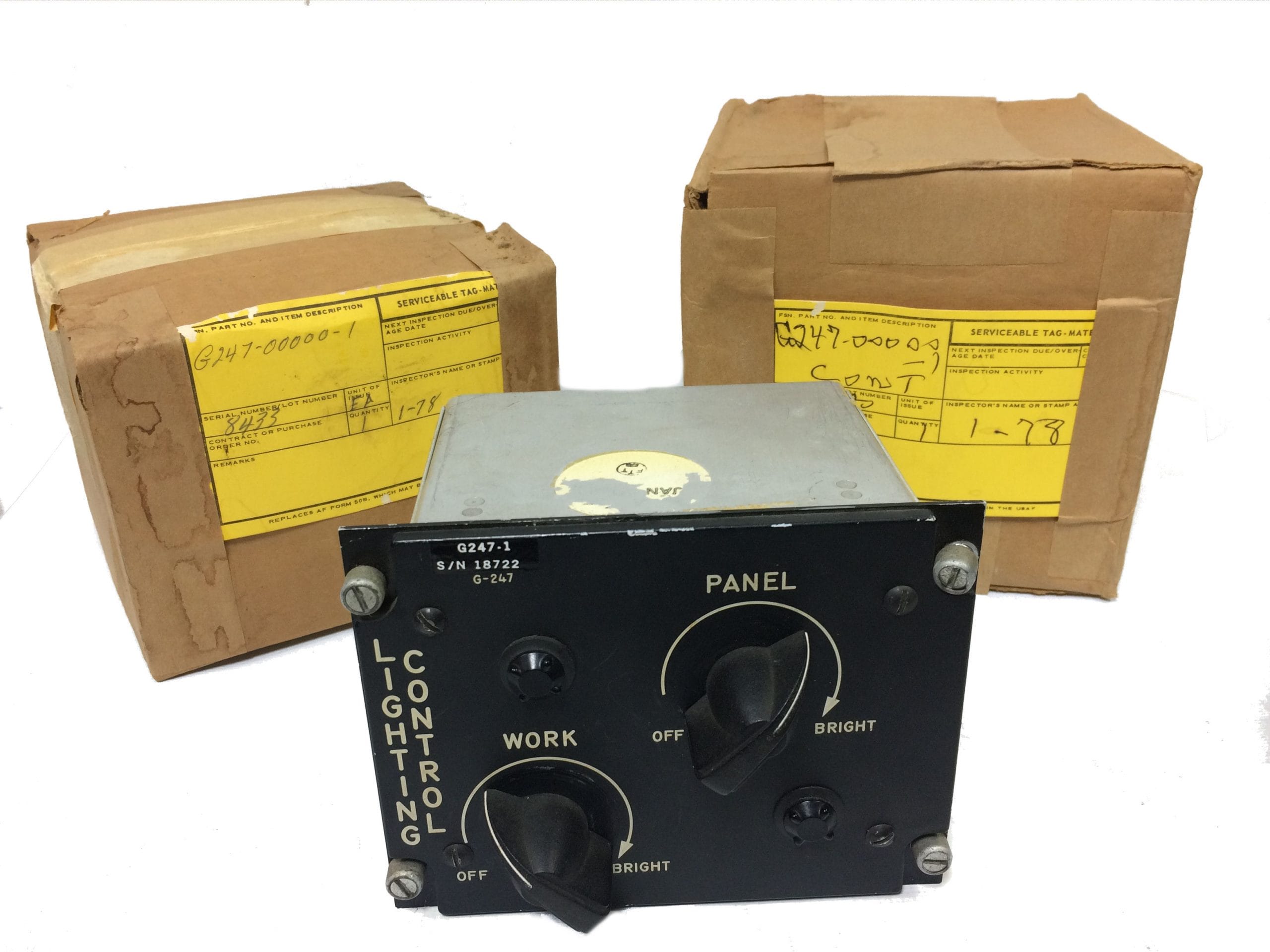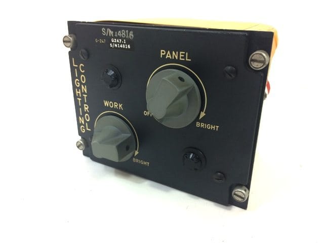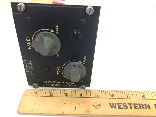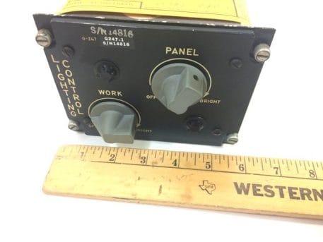 G247 Lighting control. The Aviation lighting control will make a good display in man cave. Customers buy these military aircraft gauges for projects, simulators, and decor. The control is aluminum construction with plastic face. The panel control is new old stock. Not sure if they still work. All Vietnam dates. 4 ” x 6” x 5” deep. U.S. Gov’t Surplus. This aircraft instrument control panel was for lighting in military aircraft. Mfd by LTV Electrosystems.