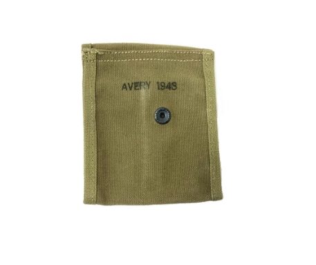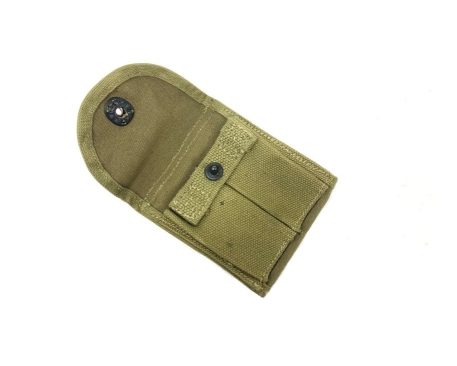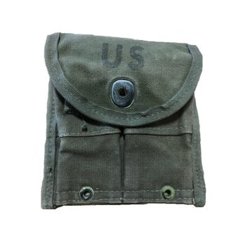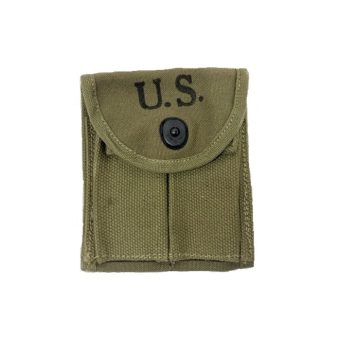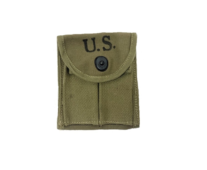 from the 1940’s It is the original issue 2 pocket 15 round magazine pouch that was originally meant to be worn on the belt. Because the belt slot was so big, soldiers began to slide on over the barrel and down onto the stock in order to have some extra clips very close for a quick change our. The button snap on the inside of the pouch was meant to snap the pouch onto the pistol belt so the pouch would not slide away from the front of the belt. Because of this snap, many carbines from that time period will, to this day, have a small indent into the wood stock from this snap pressing against the stock. we have heard that there was a pouch specifically designed to go over the stock, but we have yet to see one in person. Buy this with confidence. There are many reproductions out there, but this is an original issue dated 1943. all new, all mint. O.D. #3