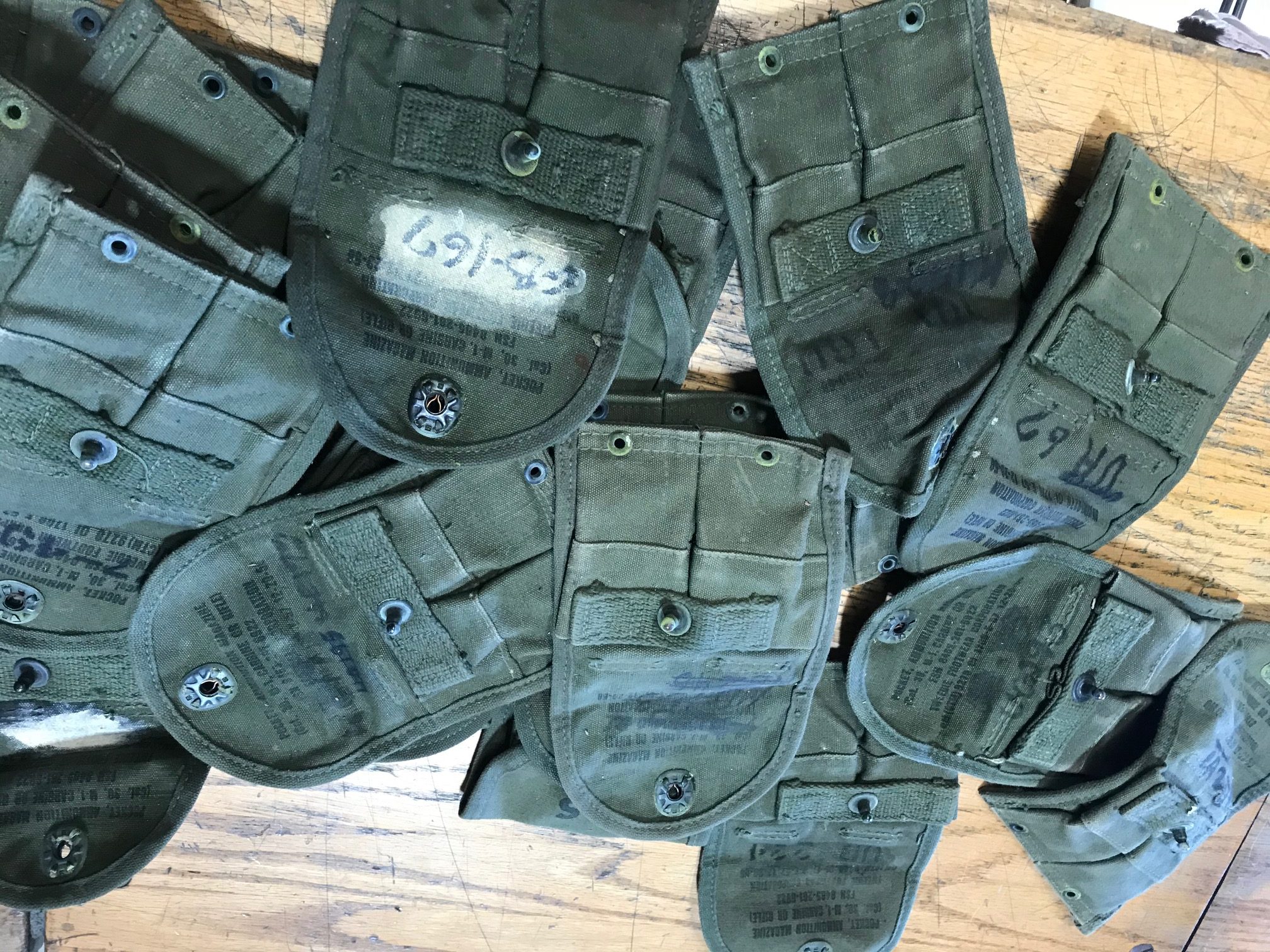 Vietnam and Korean war era issue m-1 carbine magazine pouches. These mag pouches hold 15 round magazines and they used and in good condition. The pouches have been hand labeled with unit markings of some sort. * NOTE* SOME OF THE MARKINGS HAVE BEEN CROSSED OUT*