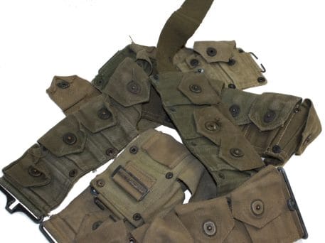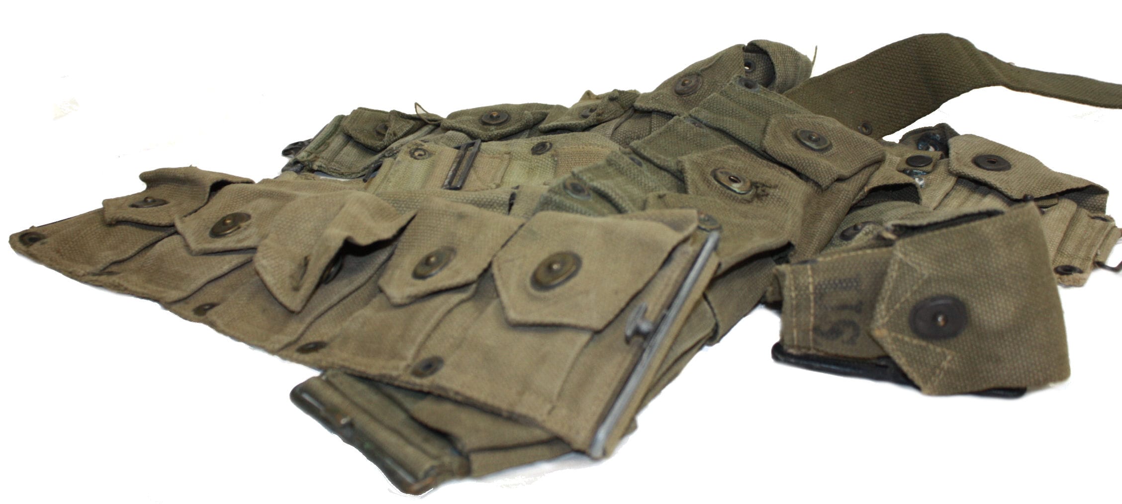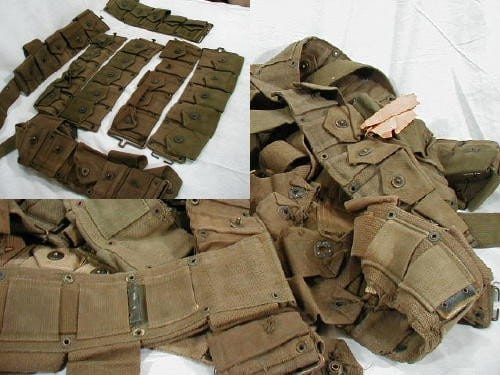 M-1 Garand Ammunition cartridge belt halves from the military issue WW2 10 pocket belts. Used condition, rough and dirty. missing snaps, incomplete with lots of holes and tears. Price is per half. 5 pockets may or may not be male or female side. Most likely missing fasteners