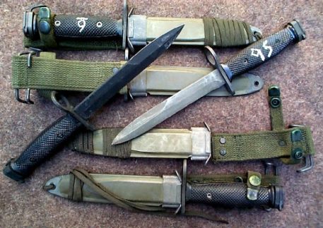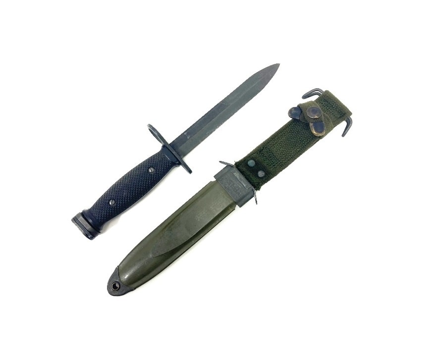 Original issue M-7. Used military surplus with plenty of dings, dents and scratches. Includes original issue sheath, but does not include the leg tie string. Designed to fit the M-16 and AR-15