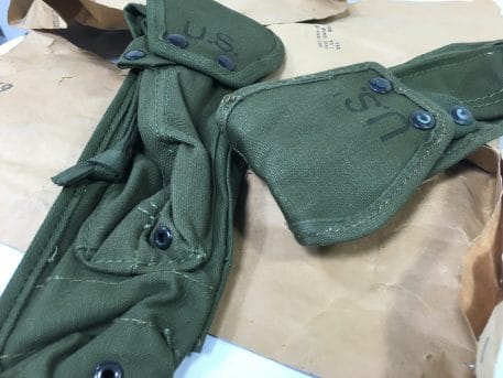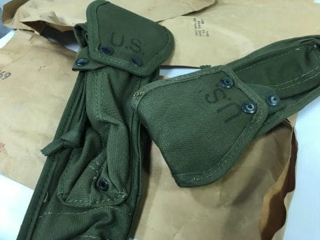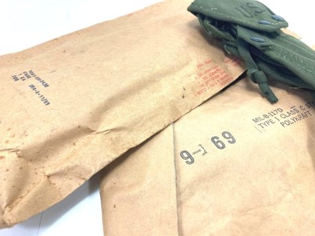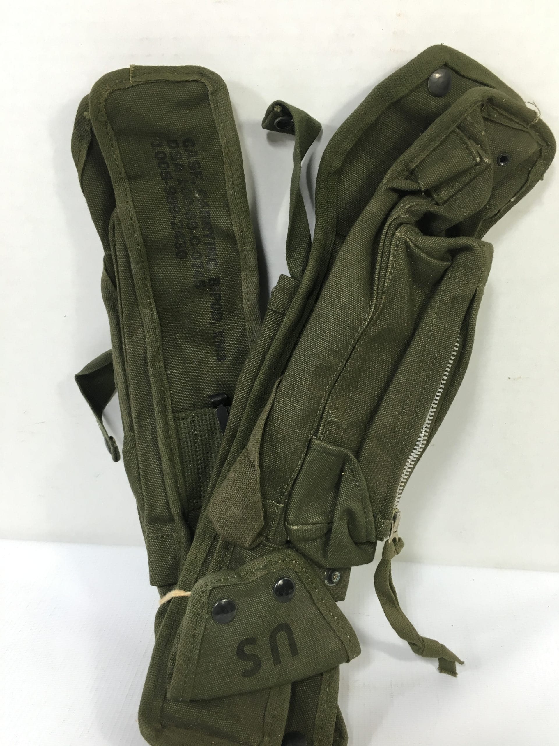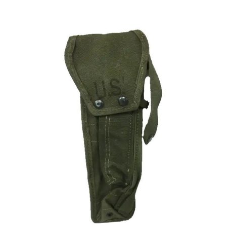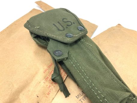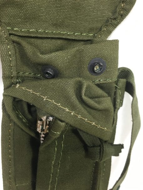 This vietnam dated bipod case is cotton canvas and can also be used to contain anything from a mag lite to tools or scopes. In addition to the main pouch measuring 11″ x 2.5″, there are also 2 external pouches with zipper and snap closure to hold a variety of accessories including P-90 mags. A single slide keeper on the back allows for a quick on and off belt carrying method. Constructed of heavy canvas material. New and unissued. Vietnam era dated.