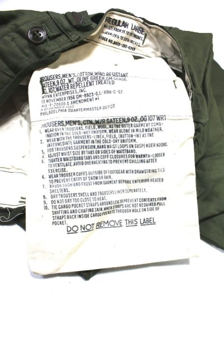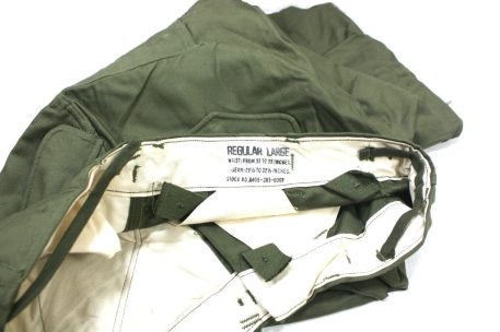 M-1951 Field Trousers, Olive Drab Large Regular, Mint Original Korean, Vietnam War, vintage surplus , M-51 Field Pant. These Field pants are olive drab, sateen cotton, with suspender loops and buttons. Buttons on the inside of the waist are for the optional field-trouser liner.