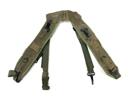 1968 dated original surplus that was repacked in 1976 and then again in 1991. They have been sitting in gov’t warehouses since Vietnam. All new original GI Surplus. Some scuff marks on the nylon adjuster straps from storage. Also very very slight oxidation on the d-rings. Accessories not included. Suspenders only