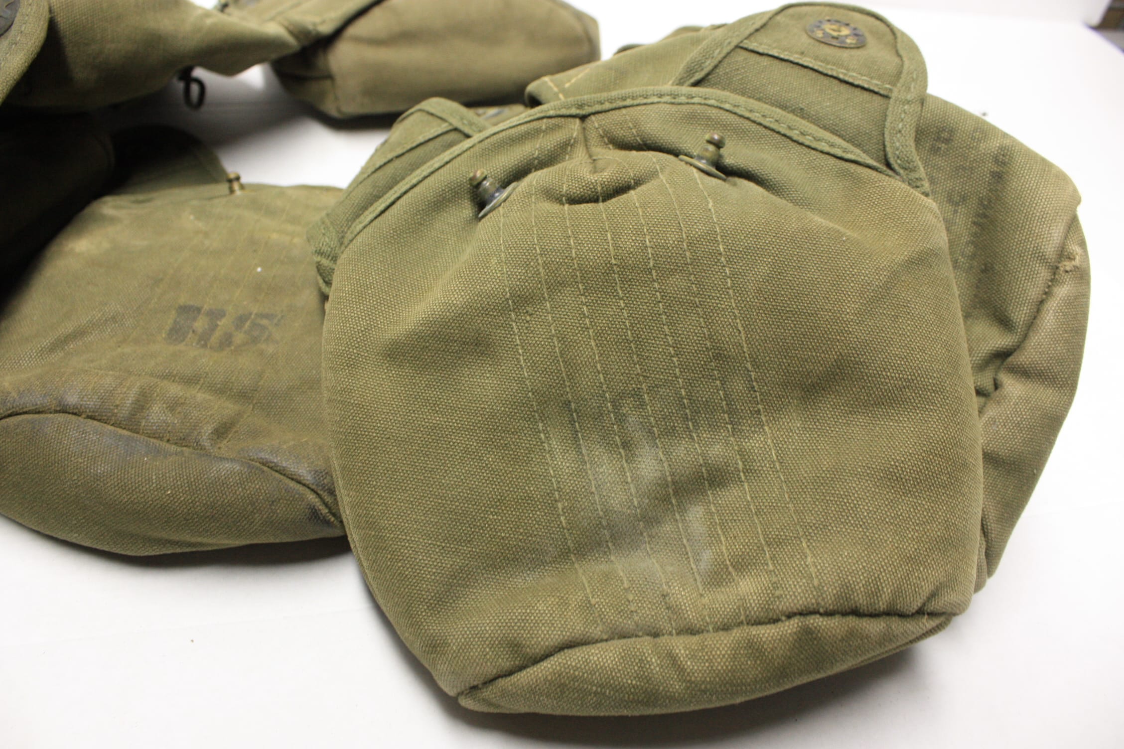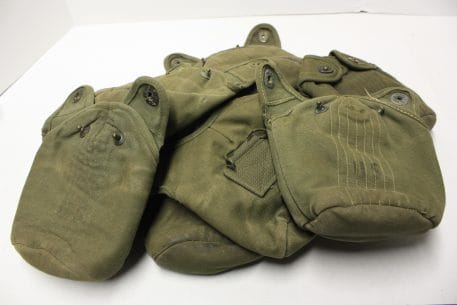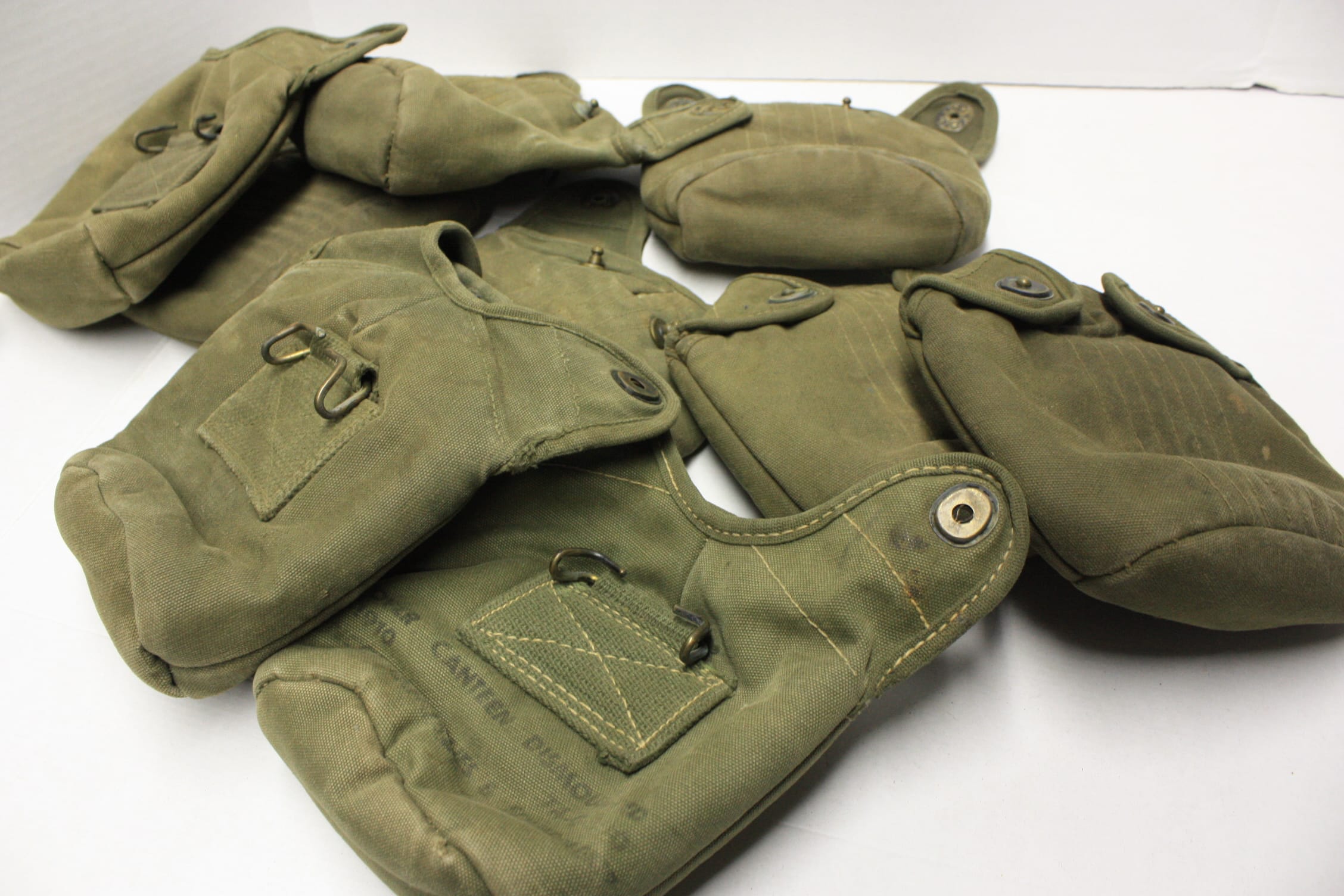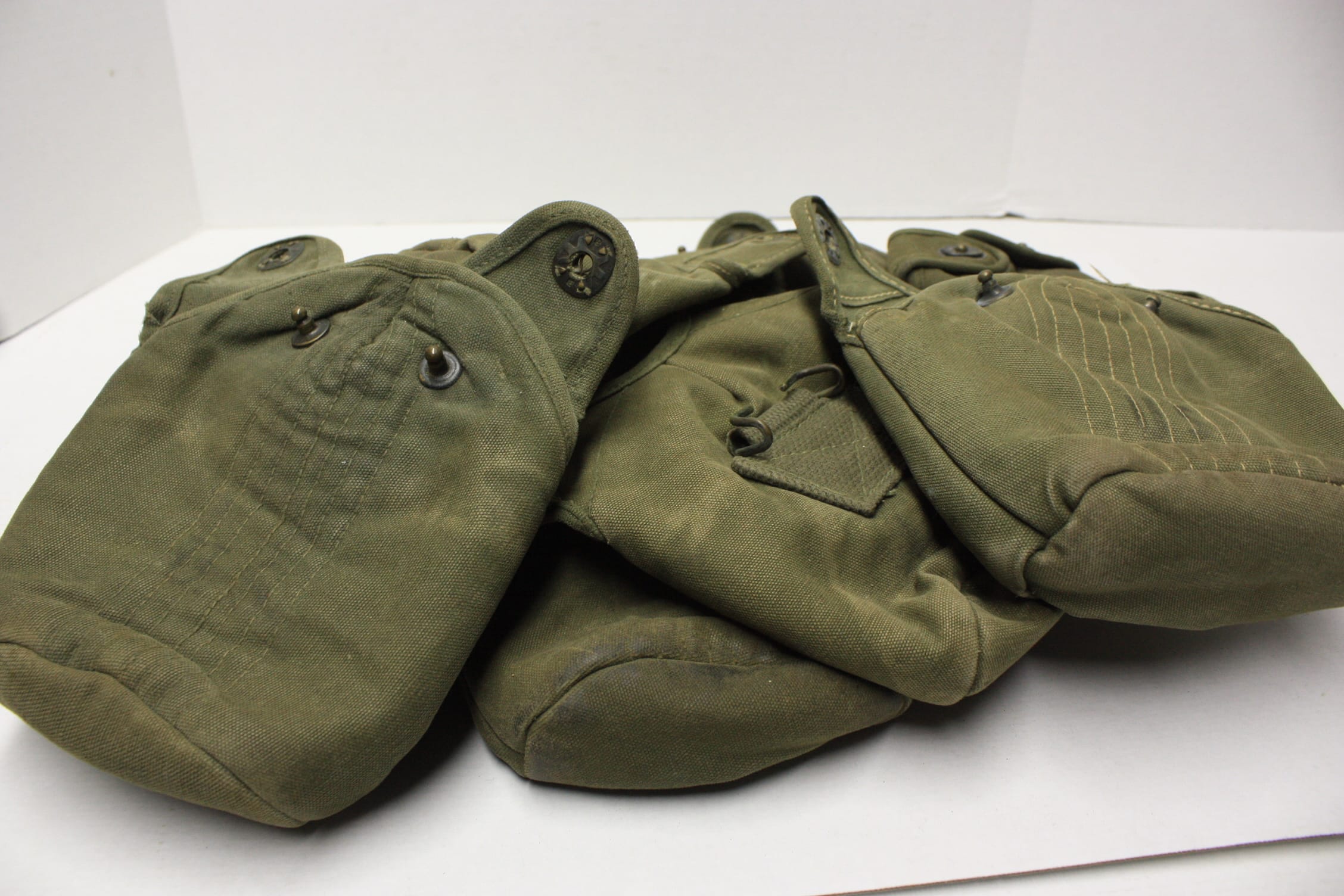 These M-56 Vietnam Canteen Covers with Wire Hook are in used condition. The covers are made of cotton canvas with lift-a-dot fasteners. Original issue canteen covers are serviceable with some stains. All of the parts and pieces on these canteen covers are intact and functioning properly.
